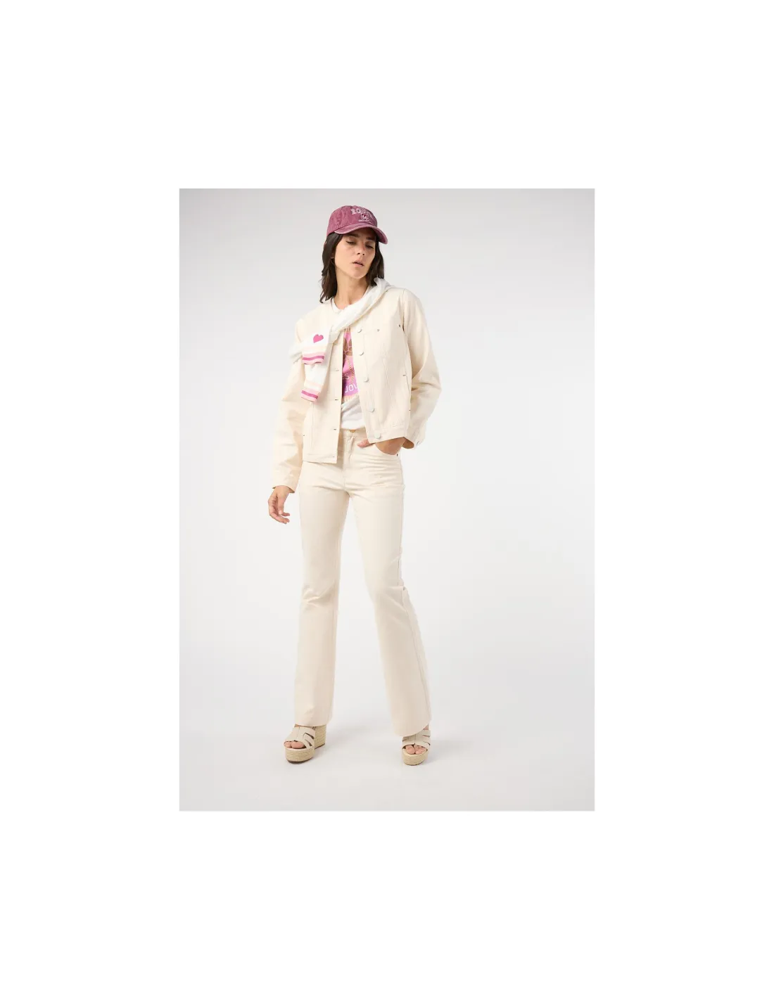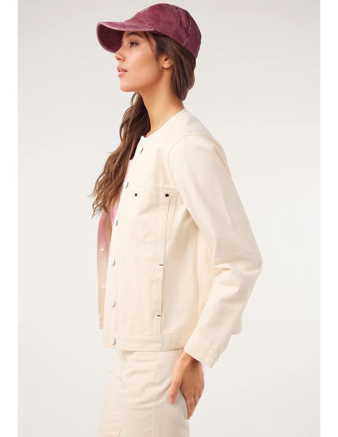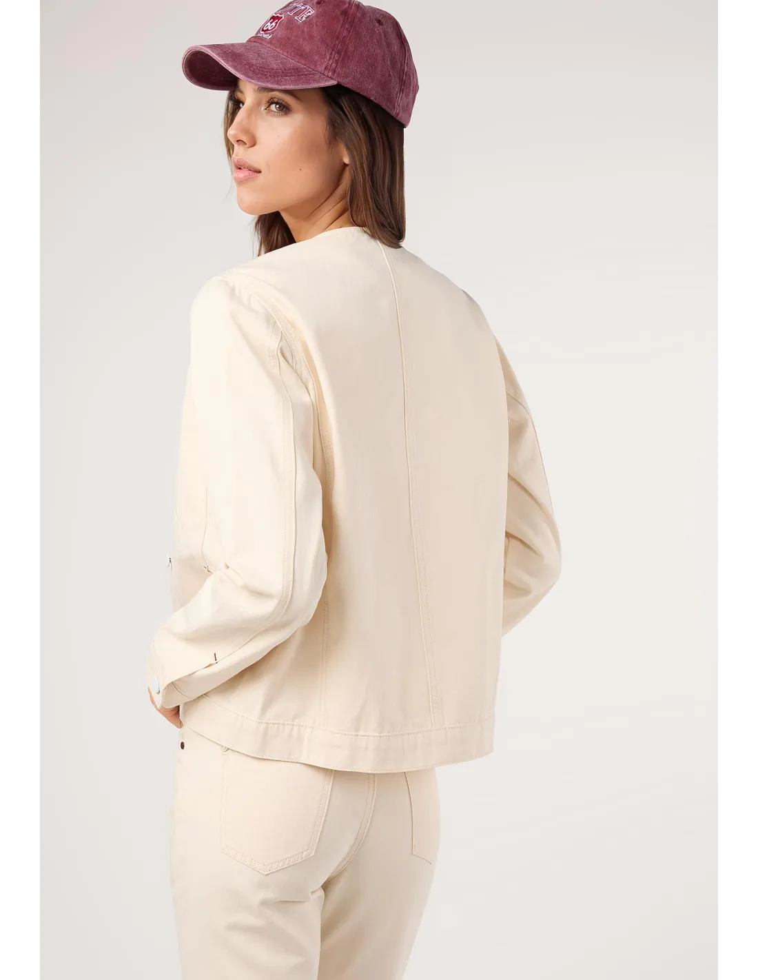 Completa tus conjuntos de diario con esta sofisticada cazadora de cuello redondo en un impecable tono crudo. Diseñada con un corte contemporáneo y pespuntes a contraste en color granate, esta prenda une la estructura de una chaqueta denim con la limpieza visual de una blusa estructurada. Sus botones metálicos blancos y los detalles de refuerzo en las costuras la convierten en la pieza de abrigo ligero ideal para quienes buscan una prenda versátil, moderna y fácil de combinar con cualquier estilo, desde un total look en tonos claros hasta un conjunto más casual con vaqueros.