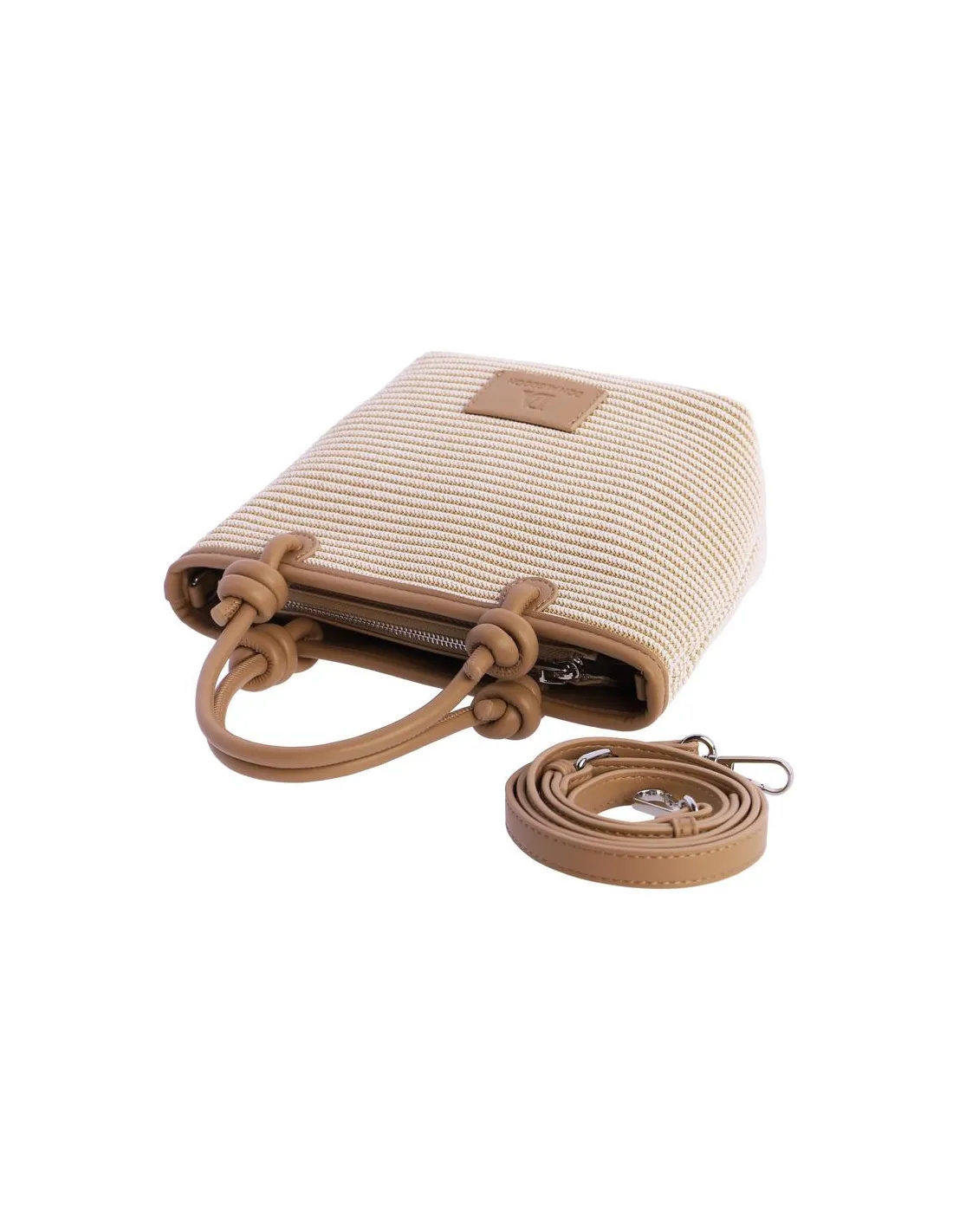Este bolso de mano de Don Algodon combina la calidez de la estética natural con la funcionalidad urbana, destacando por su cuerpo trenzado en contraste bitono y sus elegantes detalles en tono camel. Sus asas de mano con nudos decorativos aportan un toque artesanal y moderno, mientras que la inclusión de una bandolera ajustable y extraíble ofrece una versatilidad total para llevarlo al hombro. Con un cierre de cremallera superior que garantiza la seguridad de tus pertenencias y el parche frontal con el logo de la marca, este accesorio se convierte en el complemento ideal para refrescar cualquier estilismo con un aire ligero y sofisticado.