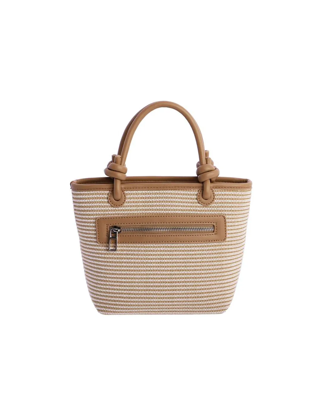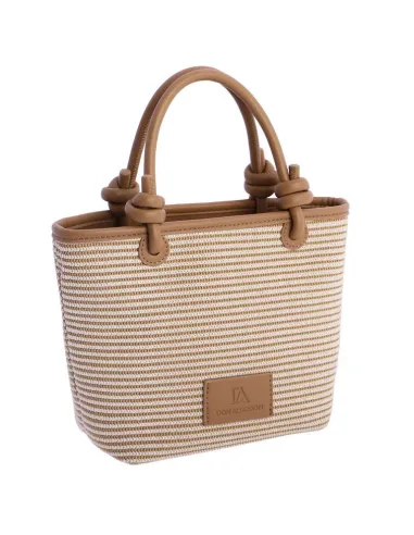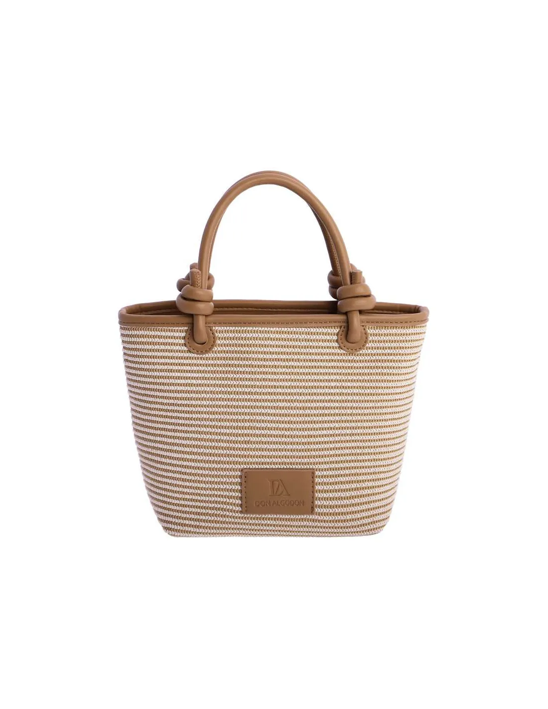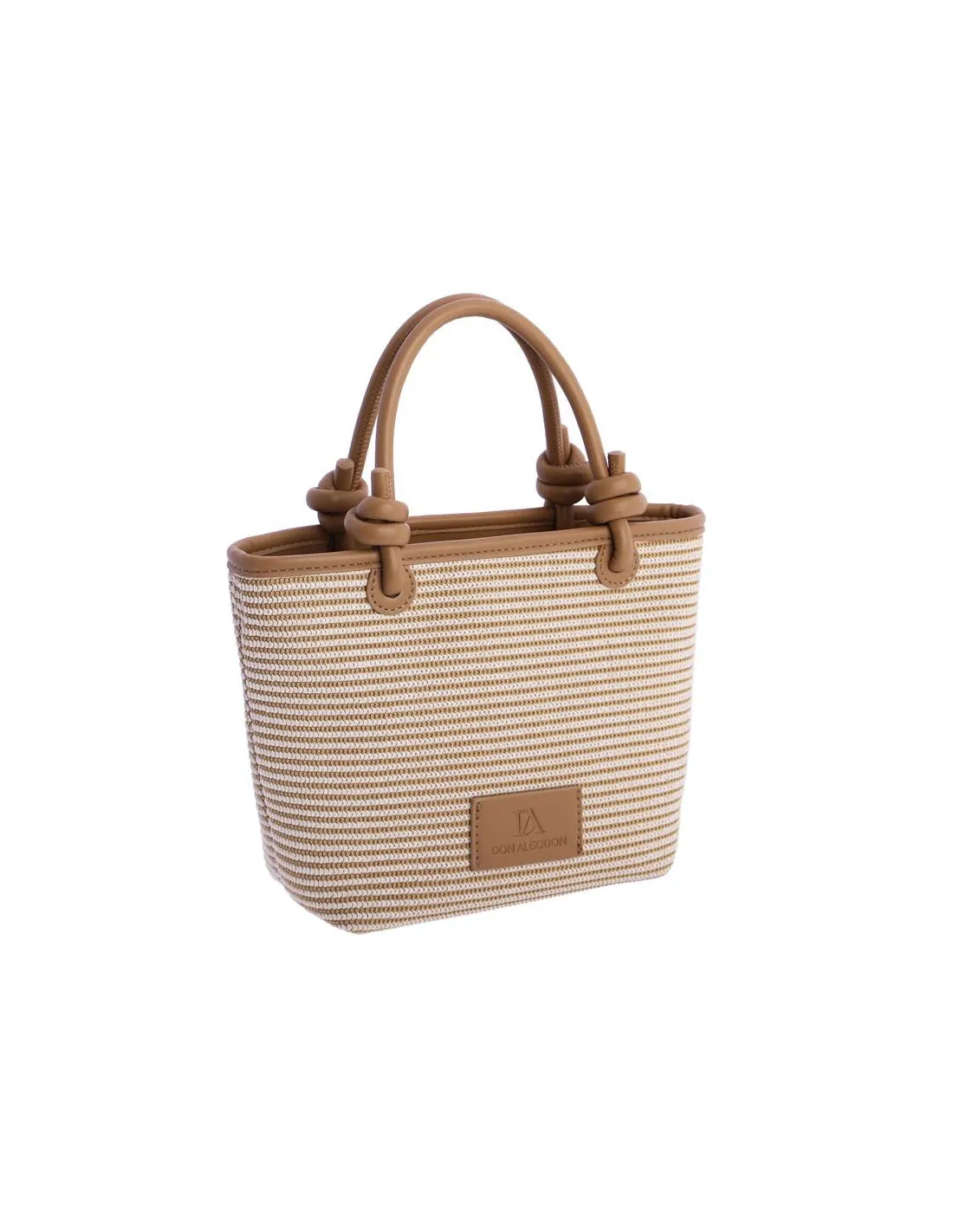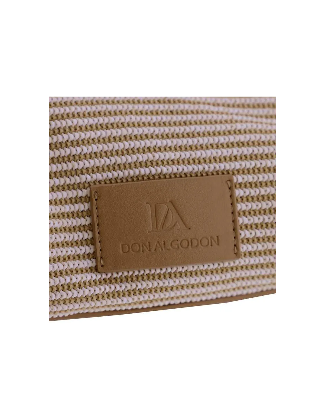El nuevo diseño de Don Algodon es una oda a la sofisticación relajada, fusionando una estructura rígida y resistente con una superficie tejida que evoca la frescura de los materiales naturales. Este bolso tipo tote pequeño destaca por su meticuloso acabado de rayas horizontales en crema y arena, enmarcado por unos bordes y asas en suave piel sintética de color camel que realzan su silueta elegante. La originalidad de este modelo reside en sus asas cortas rematadas con nudos decorativos que añaden un carácter único y femenino, complementándose perfectamente con una correa larga intercambiable mediante mosquetones metálicos para quienes prefieren la libertad de movimiento de una bandolera. En su interior, el compartimento principal ofrece el espacio justo para tus esenciales diarios, manteniéndolos siempre protegidos gracias a su robusto cierre de cremallera con tirador metálico. El parche frontal grabado con la identidad de Don Algodon sella una pieza que no solo es práctica para el día a día, sino que también funciona como el broche de oro para looks de fin de semana o eventos casuales donde el estilo natural y la calidad son los protagonistas.