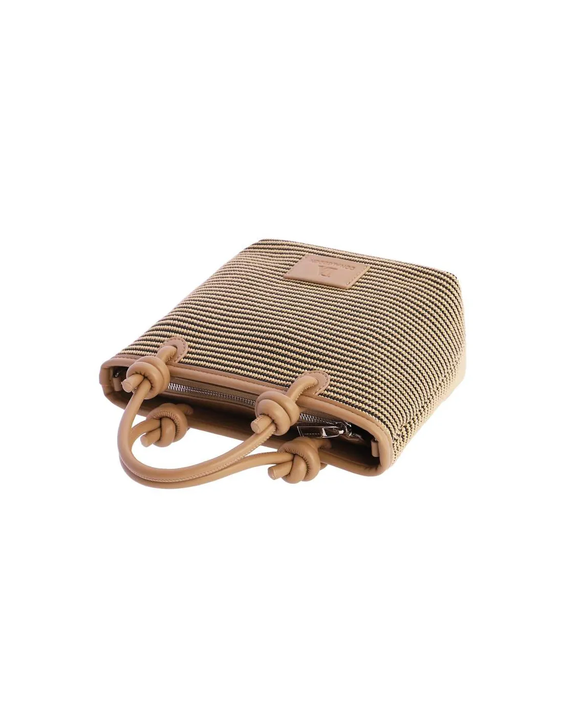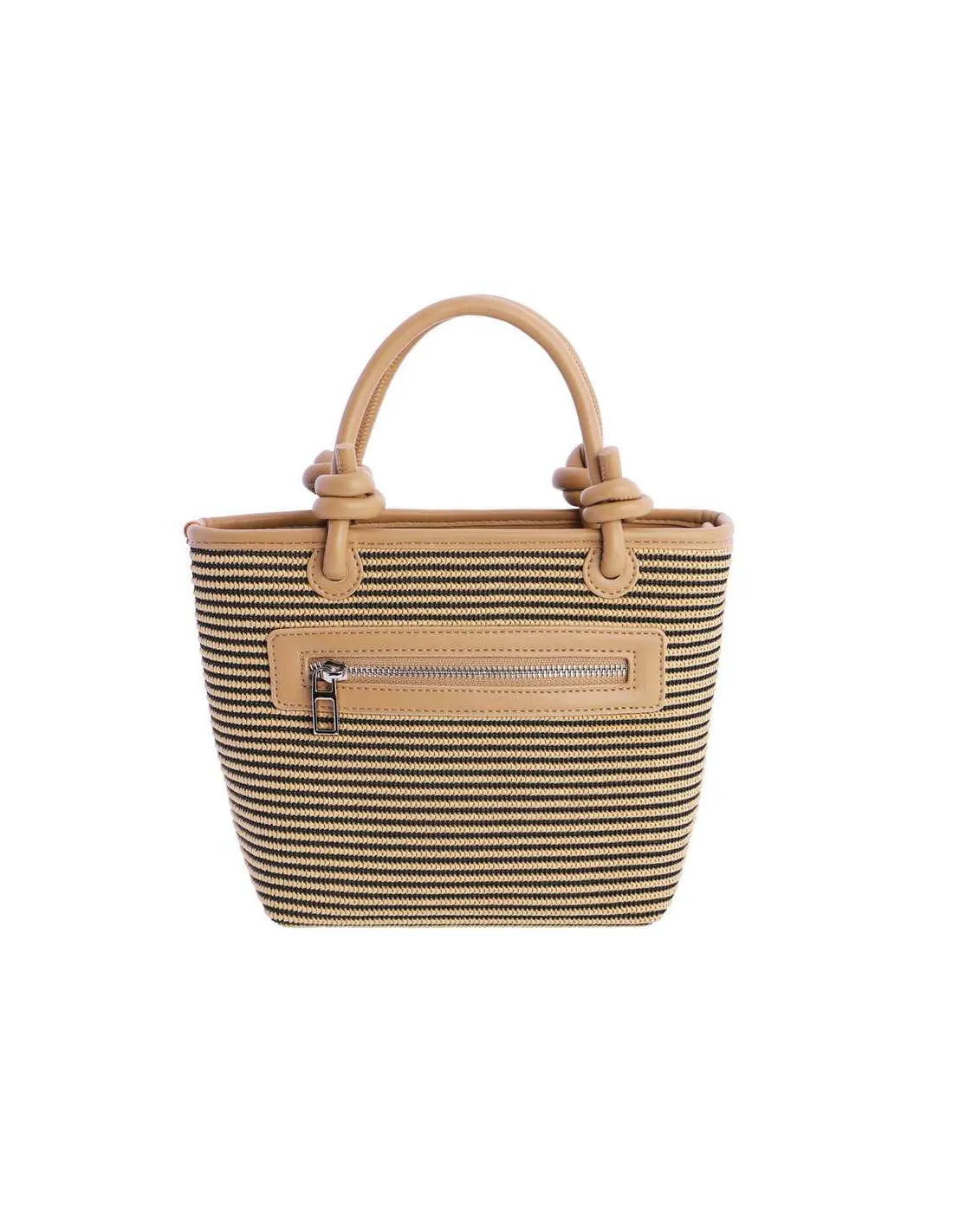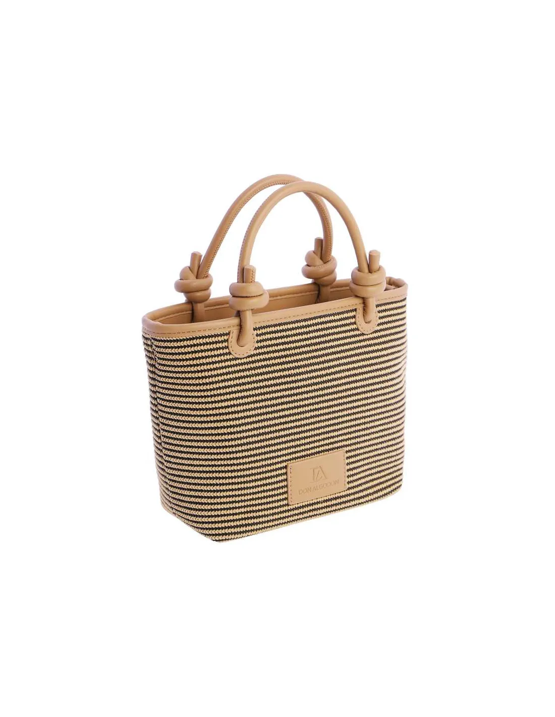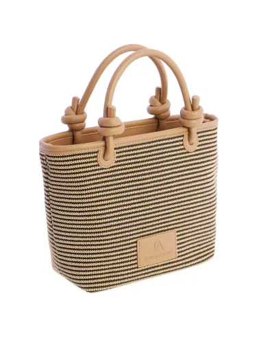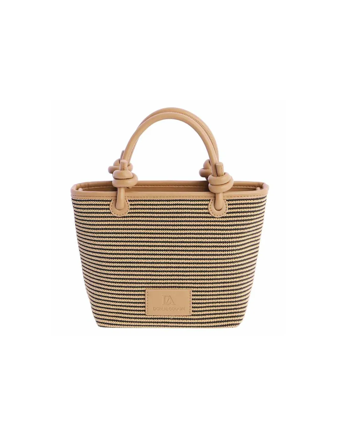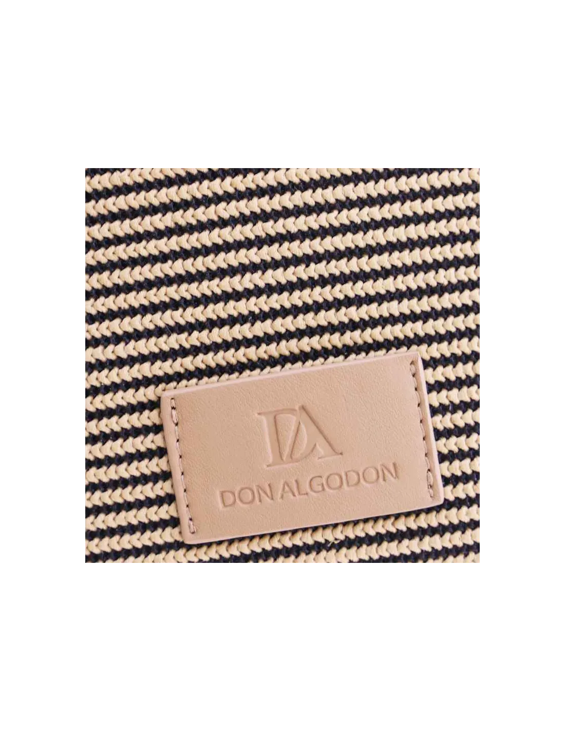 El nuevo diseño de Don Algodon es una oda a la sofisticación relajada, fusionando una estructura rígida y resistente con una superficie tejida que evoca la frescura de los materiales naturales. Este bolso tipo tote pequeño destaca por su meticuloso acabado de rayas horizontales en crema y arena, enmarcado por unos bordes y asas en suave piel sintética de color camel que realzan su silueta elegante. La originalidad de este modelo reside en sus asas cortas rematadas con nudos decorativos que añaden un carácter único y femenino, complementándose perfectamente con una correa larga intercambiable mediante mosquetones metálicos para quienes prefieren la libertad de movimiento de una bandolera. En su interior, el compartimento principal ofrece el espacio justo para tus esenciales diarios, manteniéndolos siempre protegidos gracias a su robusto cierre de cremallera con tirador metálico. El parche frontal grabado con la identidad de Don Algodon sella una pieza que no solo es práctica para el día a día, sino que también funciona como el broche de oro para looks de fin de semana o eventos casuales donde el estilo natural y la calidad son los protagonistas.