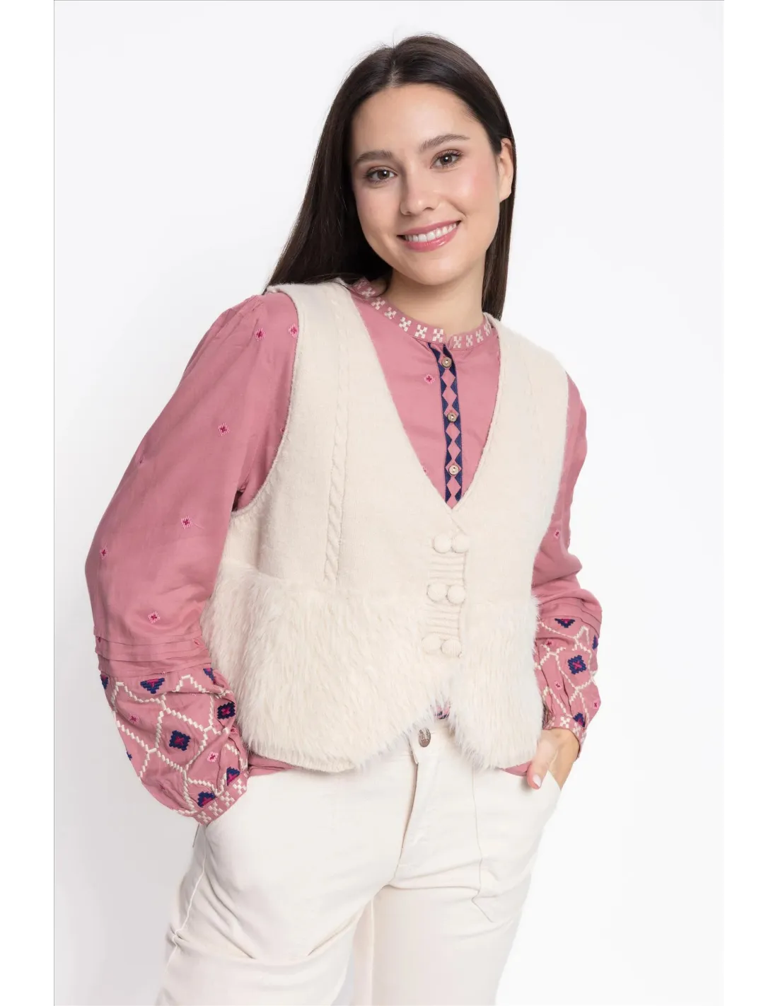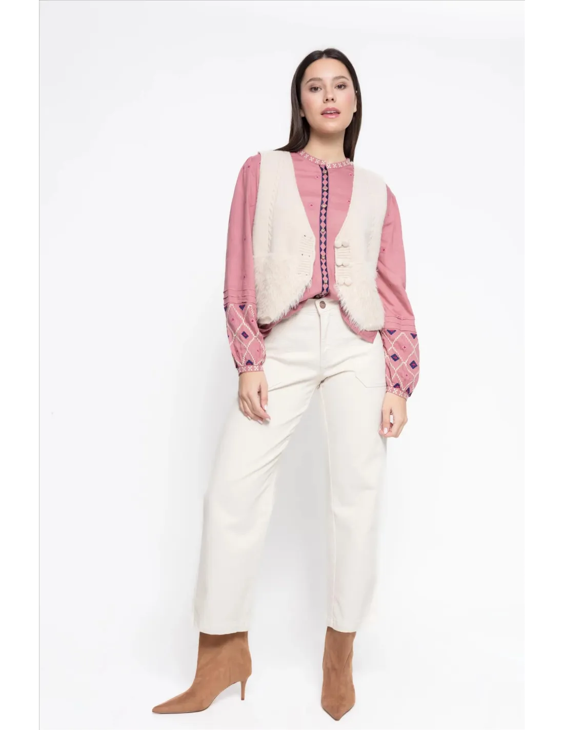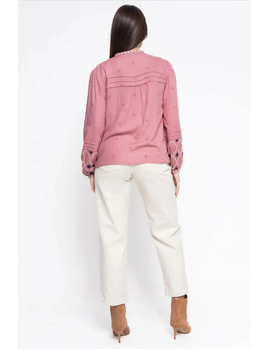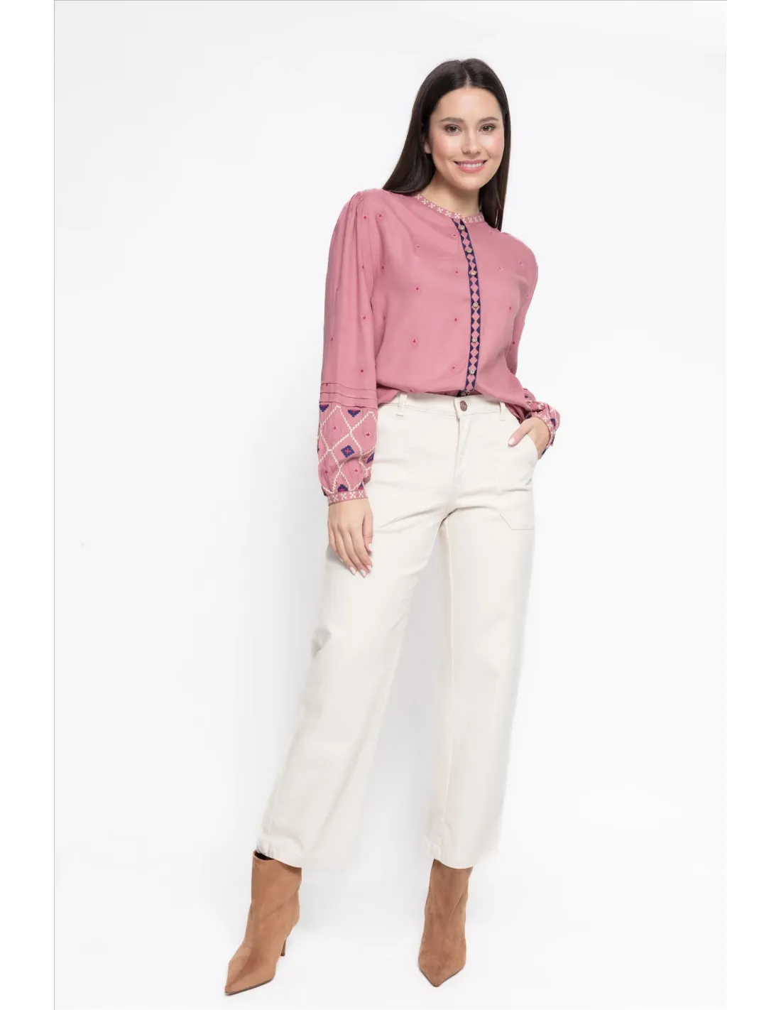 Camisa de manga larga abotonada con cuello, confeccionada en tela suave y ligera que ofrece comodidad y estilo en todo momento. Presenta delicados detalles en las mangas y en la parte delantera, que aportan un toque distintivo y elegante. Su diseño moderno y versátil la convierte en una prenda ideal para combinar con diferentes estilos, perfecta tanto para ocasiones casuales como para looks más formales.
