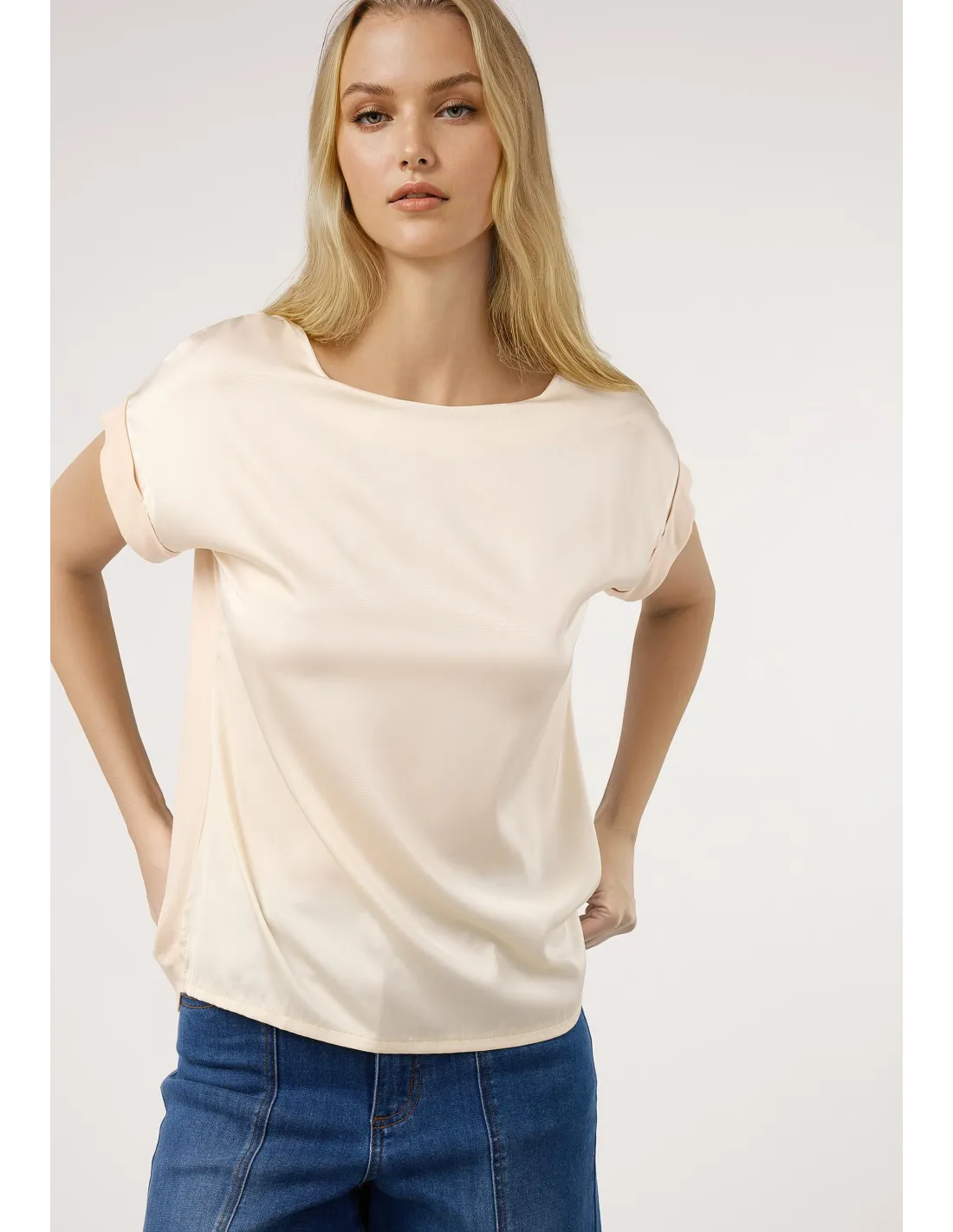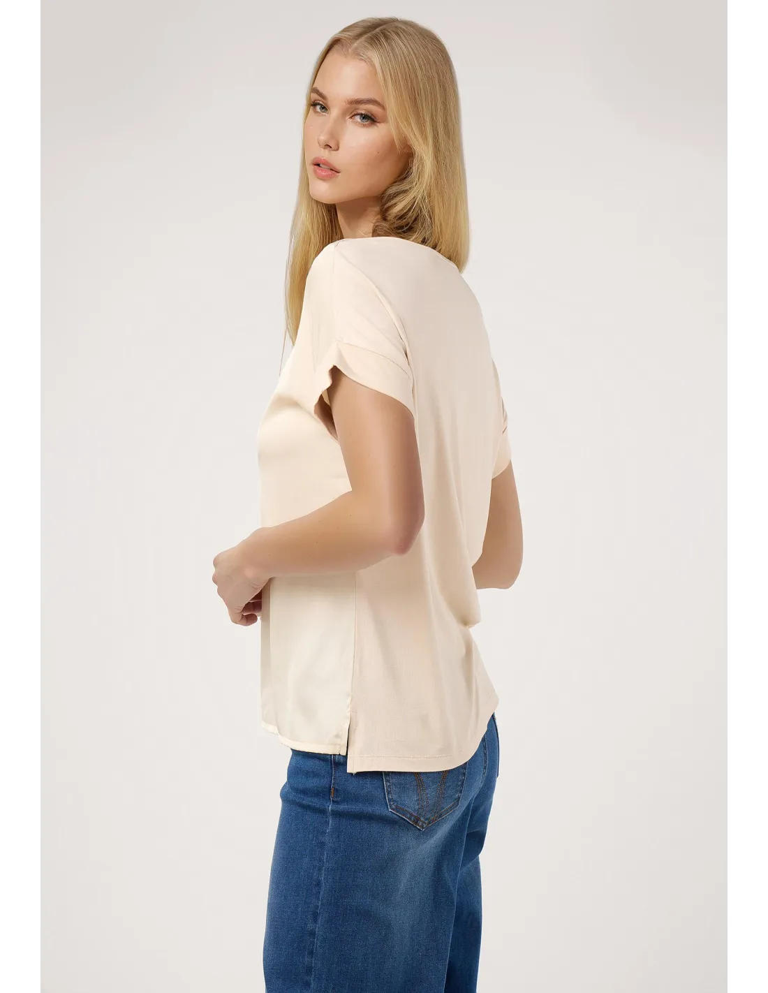 Esta camiseta de diseño minimalista redefine el concepto de básico de lujo gracias a su inteligente combinación de texturas. La parte frontal está confeccionada en un tejido de poliéster 100 por ciento con acabado satinado, que ofrece una caída fluida y una apariencia sedosa ideal para iluminar el rostro. Para maximizar el confort y la libertad de movimiento, el tejido secundario de la espalda y los acabados se compone de una mezcla de 95 por ciento viscosa y 5 por ciento elastano, proporcionando un tacto ultrasuave y una adaptabilidad perfecta a la silueta. Su diseño presenta un cuello redondo cerrado y manga corta de corte japonés que suaviza la línea de los hombros, creando una estética limpia y moderna. La dualidad de sus materiales permite que sea una prenda altamente funcional: la elegancia visual del satén se une a la transpirabilidad y elasticidad del punto. Es una opción excepcional para quienes buscan una prenda todoterreno que no requiera grandes cuidados pero que mantenga siempre una apariencia impecable y profesional.