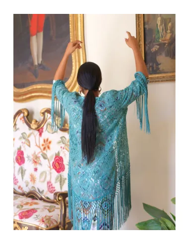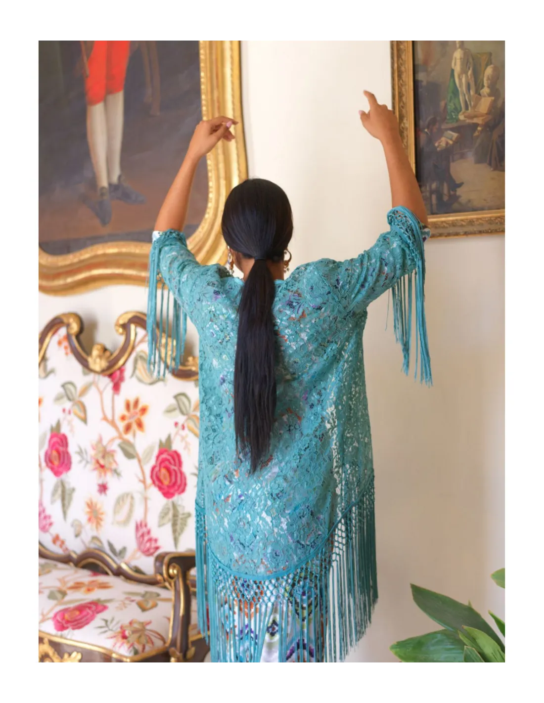 ¡Añade un toque de elegancia y sofisticación a tu look con nuestra *Chaqueta Rumba*! Confeccionada en delicado encaje verde agua, esta prenda es perfecta para resaltar tu estilo único. Su diseño con manga y forma de mantón, adornado con flecos al tono en el filo, le da un aire de distinción y movimiento.