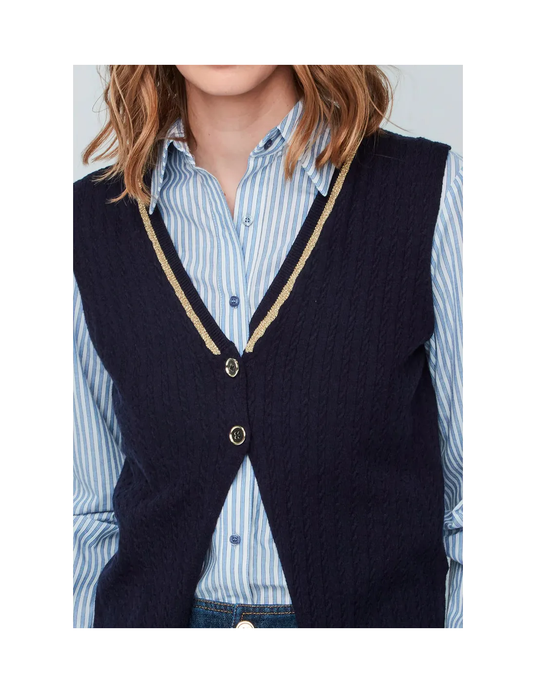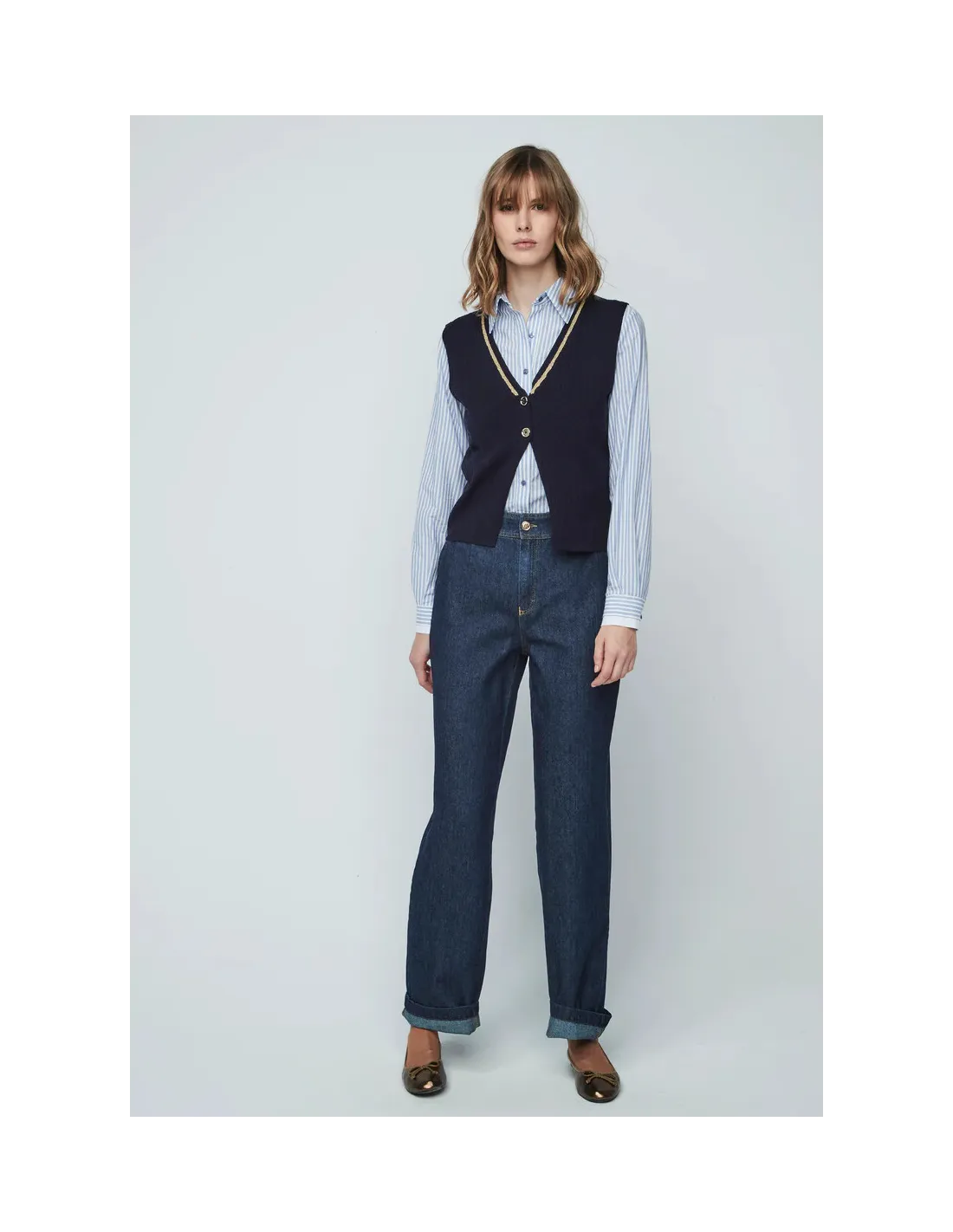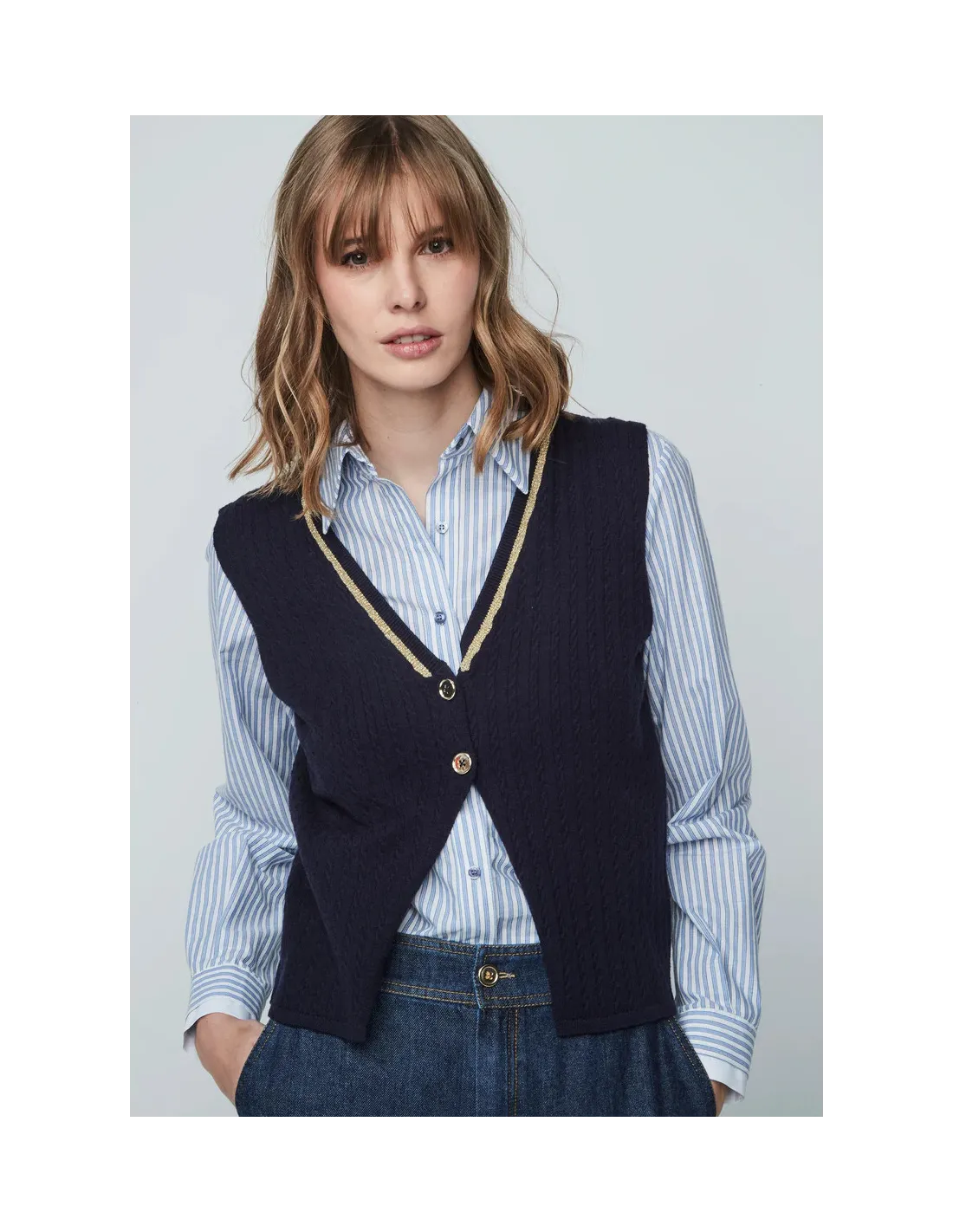 Chaleco de canalé fino con detalles en contraste en el cuello y los puños. Presenta cierre frontal con botones y un diseño ligeramente corto que aporta un toque moderno. Perfecto para llevar sobre camisas o camisetas básicas y crear conjuntos equilibrados y versátiles.