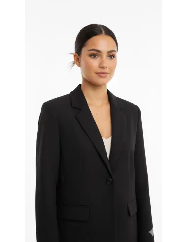 Redefine tu vestuario con esta americana negra, una pieza maestra de la sastrería moderna que combina la versatilidad y la sofisticación atemporal. Esta no es una simple chaqueta; es el pilar de un armario inteligente, diseñada para llevarte con elegancia desde una reunión de trabajo importante hasta una cena especial. Su corte impecable y ligeramente oversize o de diseño estructurado, dependiendo del modelo, te garantiza una silueta actual y favorecedora. Confeccionada con un tejido que ofrece una caída perfecta y un tacto suntuoso, la americana negra es sinónimo de confianza. Llévala con un pantalón a juego para un total look formal, o combínala con jeans y una camiseta para un estilo smart-casual inigualable. Es la inversión definitiva en elegancia duradera.