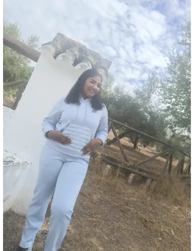 Sudadera tipo conjunto de chándal con un diseño moderno y cómodo, ideal para el día a día. Cuenta con capucha ajustable que aporta un toque urbano y práctico. Presenta detalles enguatados en las mangas y en el bolsillo delantero de la zona de la barriga, que le añaden textura y estilo, además de ofrecer un extra de confort. Su tejido suave y agradable al tacto la convierte en una prenda perfecta para lucir con un look casual o deportivo.