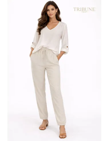 Presentamos nuestros nuevos pantalones de lino para mujer, diseñados pensando en la comodidad y el estilo relajado para tus días de verano. Estos pantalones beige claro, elaborados en una mezcla de lino de alta calidad, son increíblemente suaves y transpirables, perfectos para los días más calurosos. Su corte holgado y pierna ancha te ofrecen una total libertad de movimiento, para que puedas disfrutar de cada momento sin restricciones.