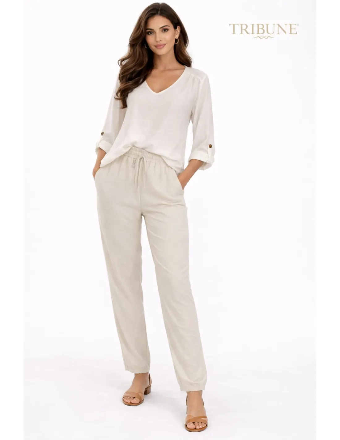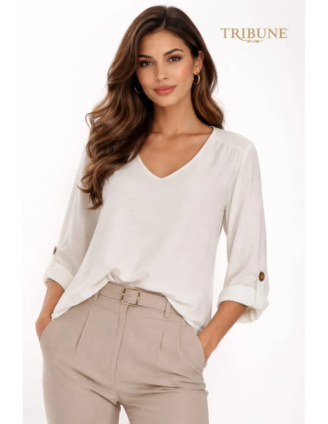 ¡Renueva tus básicos de primavera con nuestra elegante blusa de punto Tribune! Esta prenda versátil, de color blanco roto y corte holgado, presenta un favorecedor cuello en V y mangas tres cuartos ajustables con lengüetas y botones marrones. Ideal para lograr un look sofisticado e informal a la vez, te encantará su comodidad y su tacto suave.