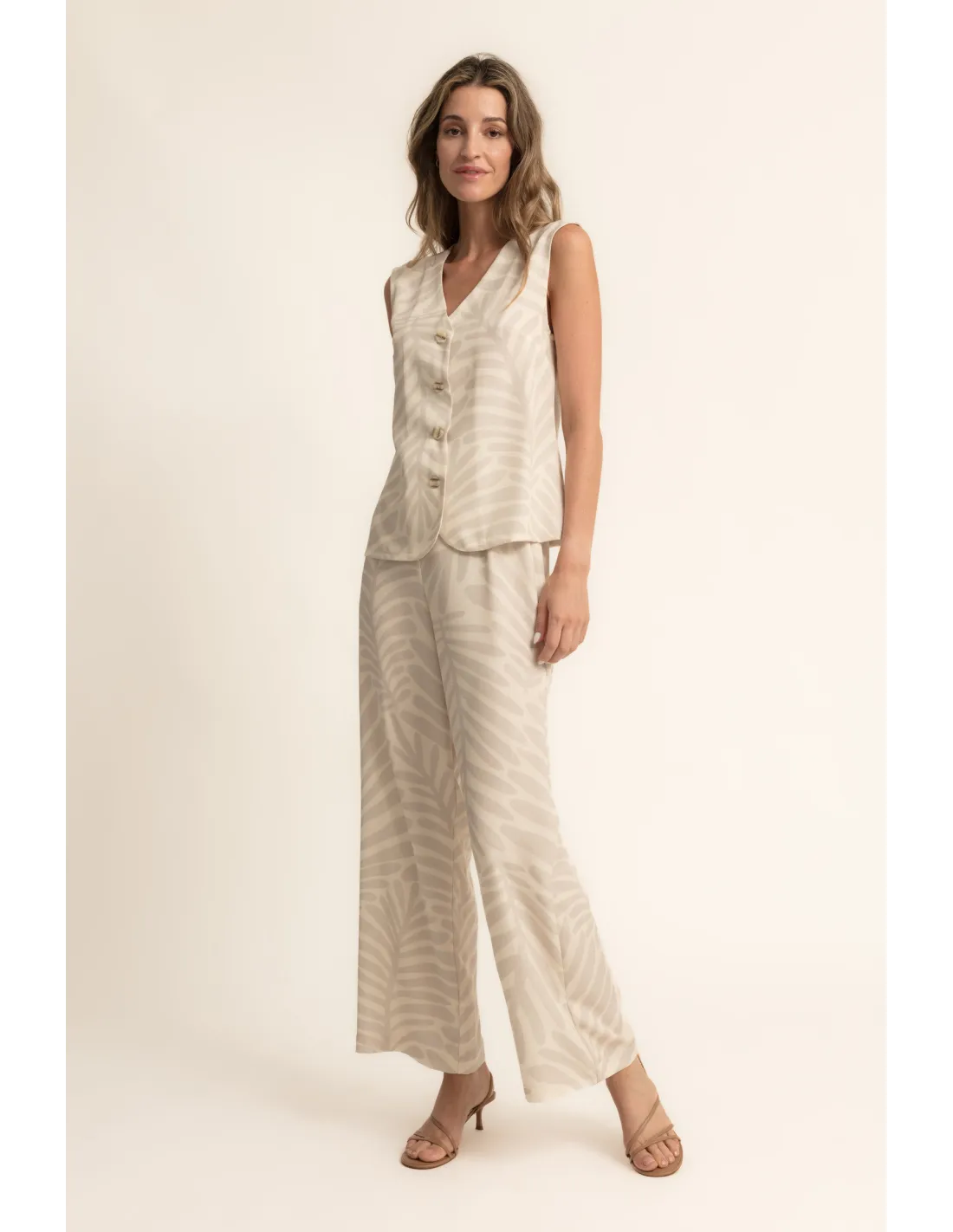 El Chaleco-Blusa Juliet es la combinación ideal entre la estructura de la sastrería moderna y la frescura de los tejidos ligeros. Diseñada para la mujer que busca comodidad sin sacrificar el estilo, esta prenda destaca por su estampado orgánico de hojas en tonalidades neutras, fácil de adaptar a cualquier ocasión.