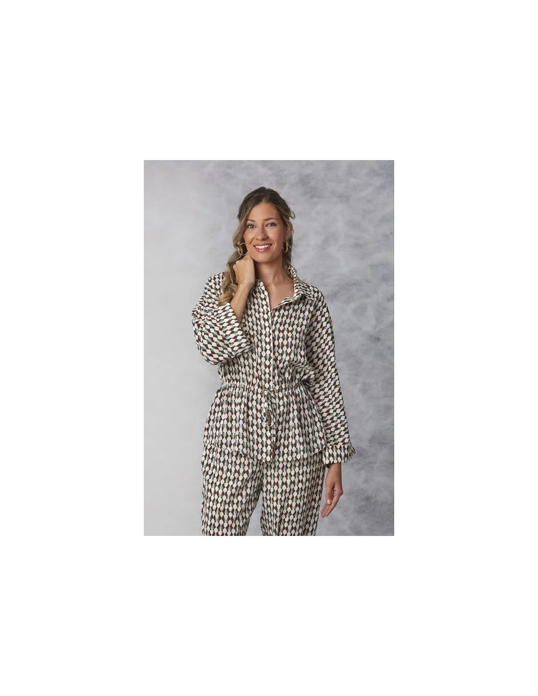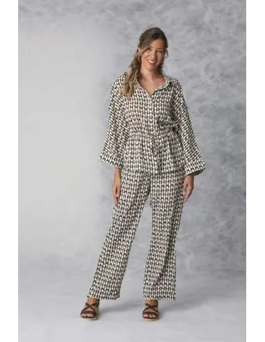 Descubre la versatilidad con este conjunto compuesto por una blusa de cintura ajustable y pantalón de caída ligera. Con un diseño de rombos retro en tonos neutros y azules, es la elección perfecta para quienes buscan un look completo, sofisticado y extremadamente cómodo. Ideal para eventos tipo cóctel o para elevar tu estilo diario.