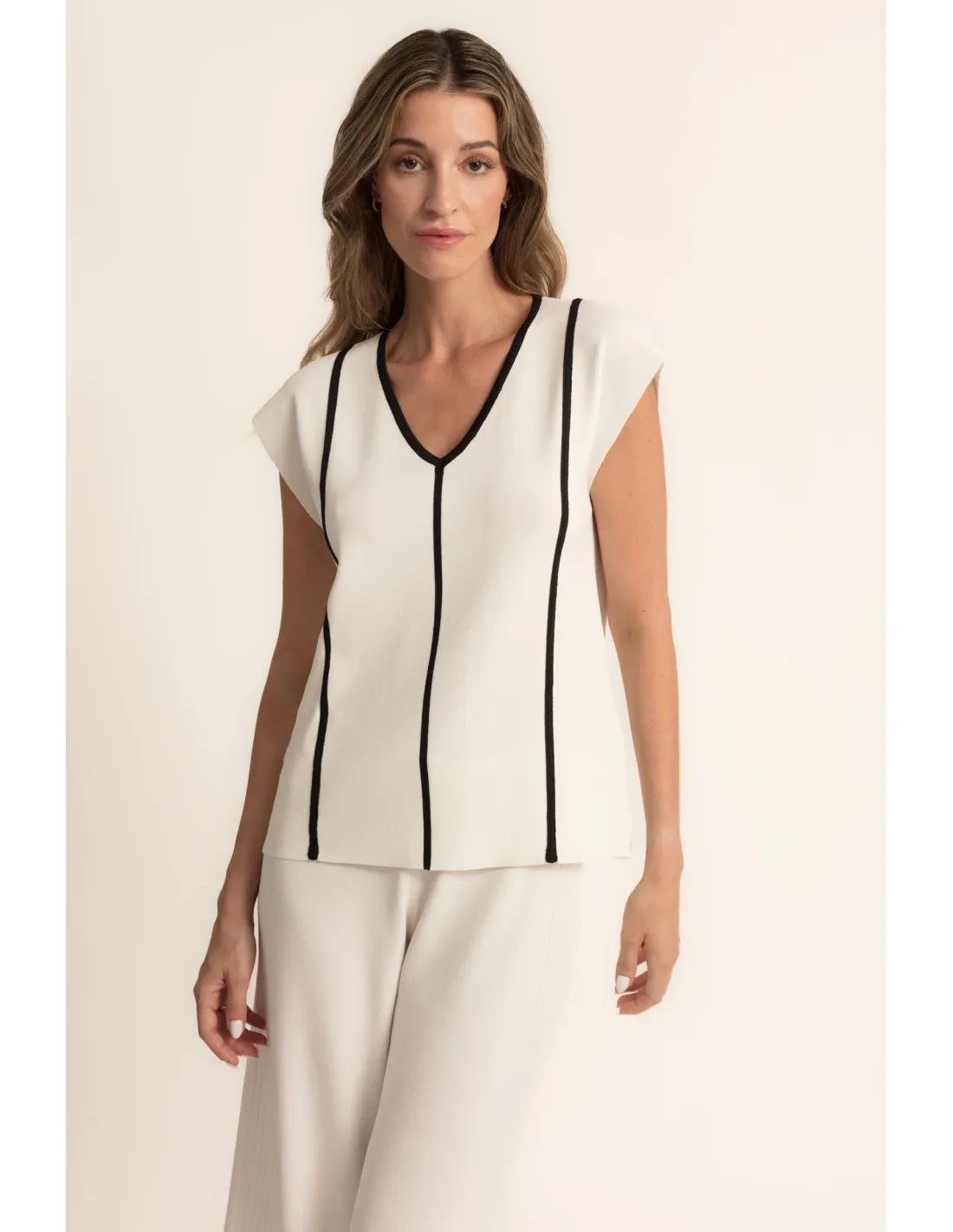 Su corte es limpio, con un cuello en pico sutil que favorece la silueta y unas mangas de sisa o casquillo que aportan un toque moderno y cómodo, ideal para los días más cálidos. La verdadera declaración de diseño se encuentra en los contrastes de las líneas verticales en negro intenso, que recorren la pieza desde los hombros hasta el dobladillo, creando un efecto visual minimalista y arquitectónico muy refinado. Esta estructura lineal no solo es un detalle chic, sino que también ayuda a estilizar la figura. Es una prenda sumamente versátil, que puede elevarse con unos pantalones de vestir a juego para un conjunto de dos piezas impecable o combinarse con unos vaqueros oscuros y unos tacones para una cena elegante. La simplicidad de su paleta de colores y la claridad de sus líneas lo convierten en una base perfecta para cualquier accesorio.