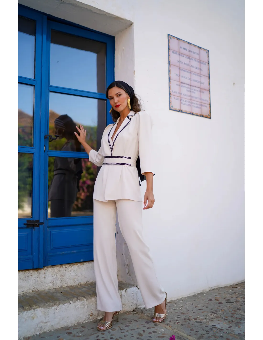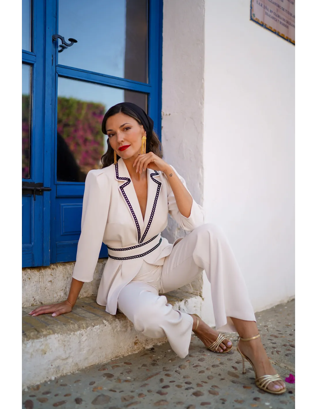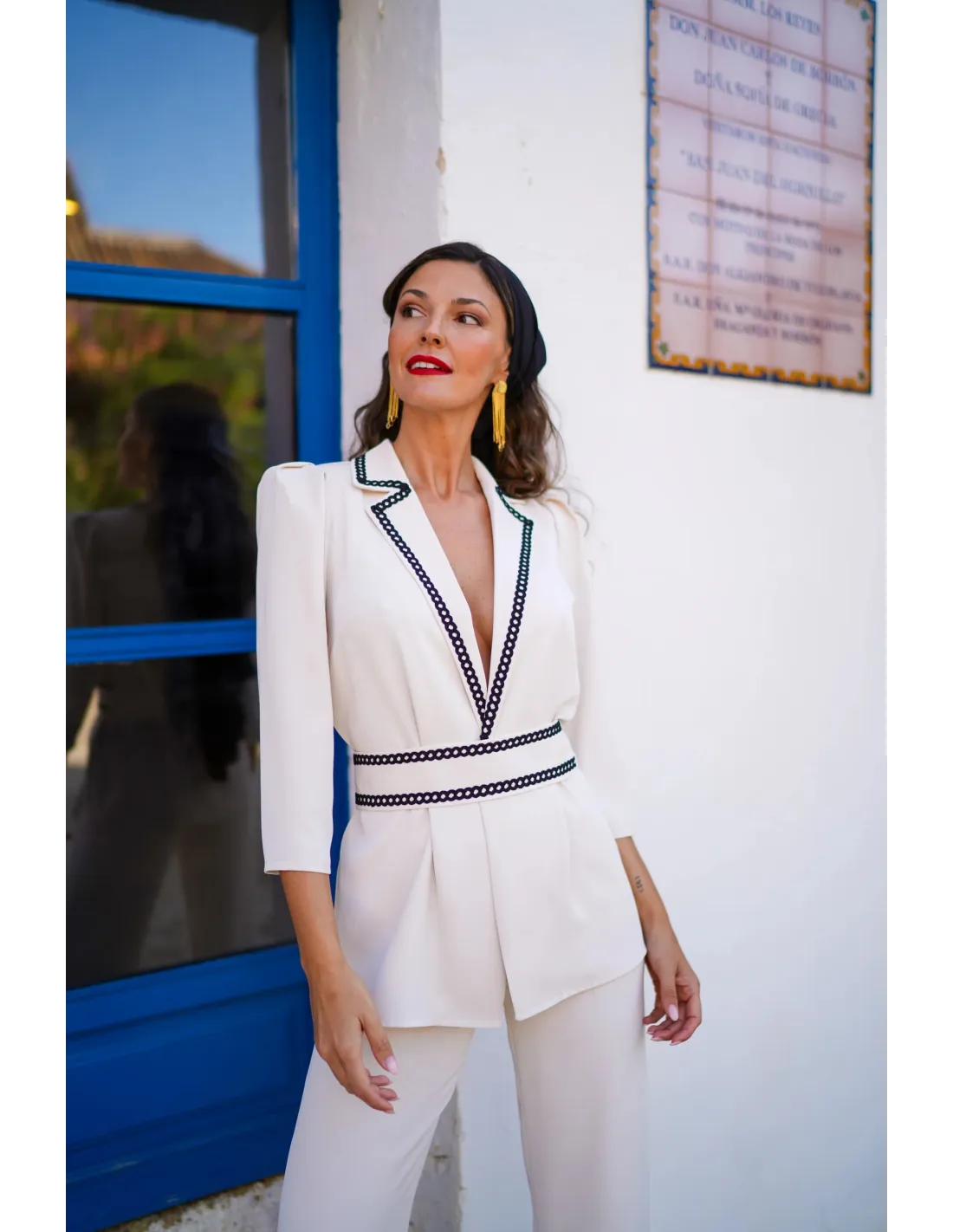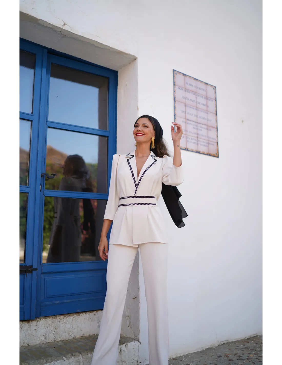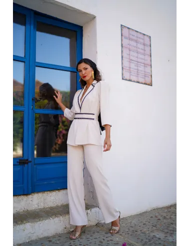 Eleva tu armario con este exclusivo conjunto de dos piezas, diseñado para la mujer que busca elegancia y comodidad en una sola silueta. La parte superior consiste en una chaqueta de cuello sastre y manga tres cuartos, destacada por un exquisito ribete bordado en contraste que enmarca el escote y define la cintura, realzando la figura de forma natural. Se complementa con un pantalón de talle alto y corte recto que aporta movimiento y ligereza a cada paso.