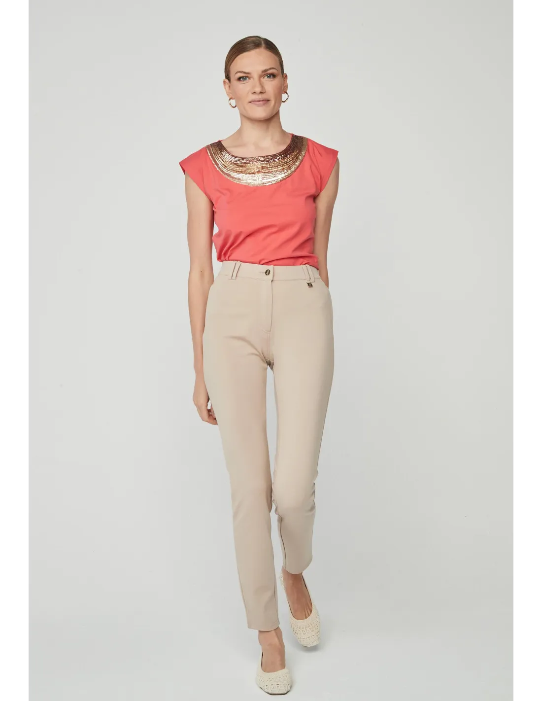 Este pantalón de mujer skinny está confeccionado en un tejido super elástico que se adapta perfectamente al cuerpo, proporcionando comodidad y libertad de movimiento. Con detalles de cremalleras que le dan un toque moderno y estilizado, está hecho con una mezcla de 70% viscosa, 26% poliamida y 4% elastano, lo que garantiza suavidad, resistencia y elasticidad. Ideal para un look casual o más elegante, es una prenda versátil y cómoda que resalta la figura de manera sofisticada.