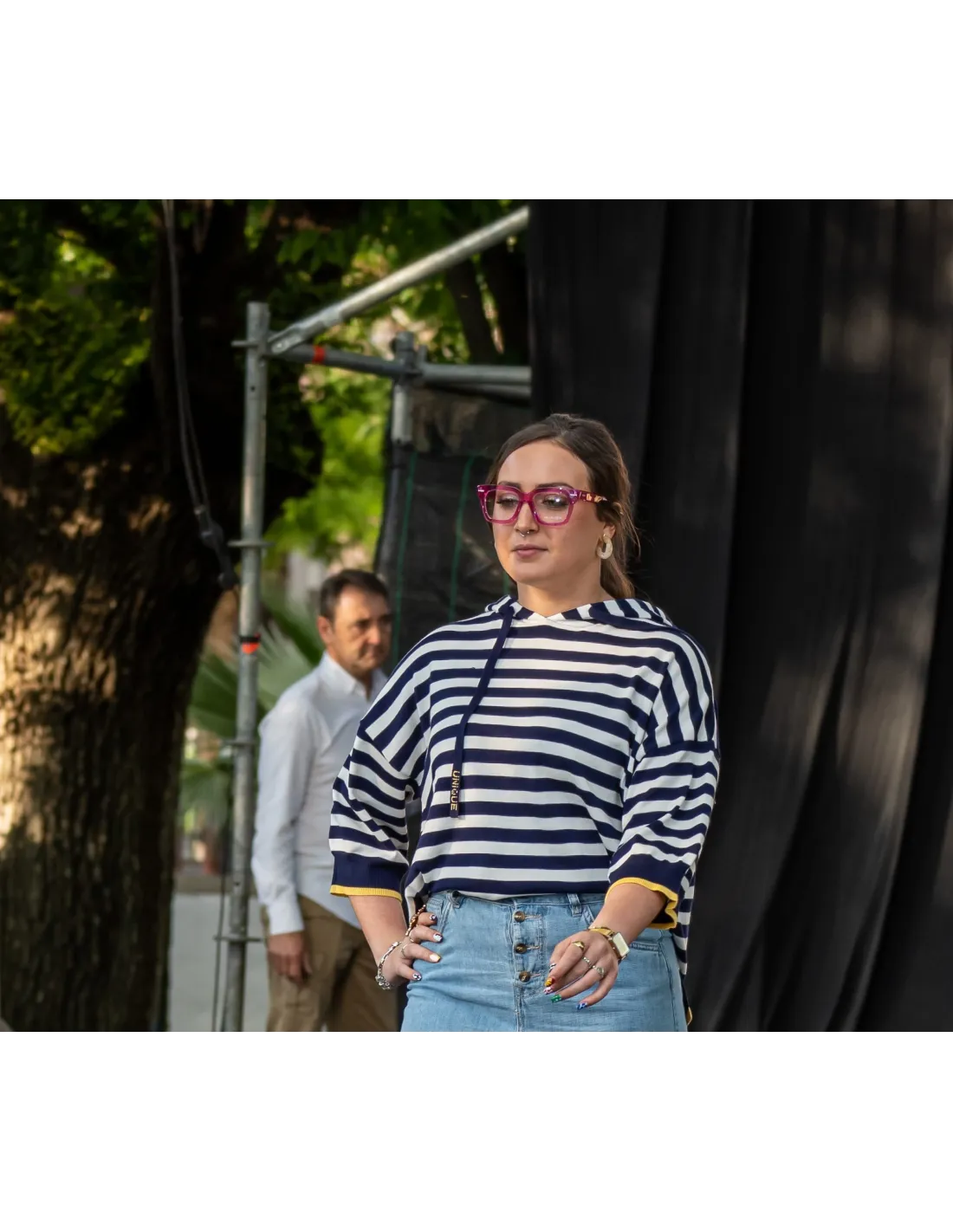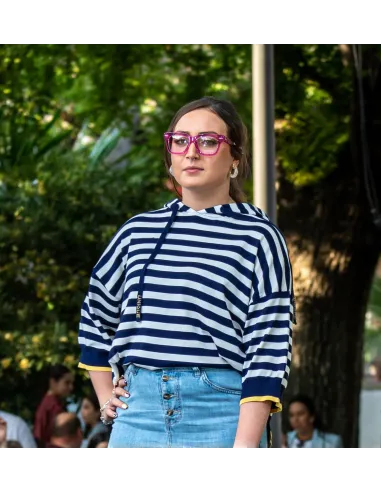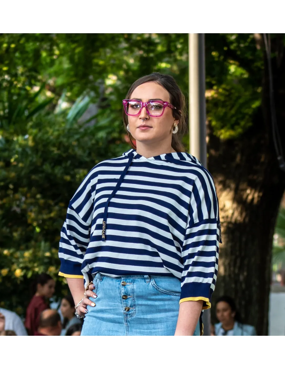 Sudadera oversize de rayas en tonos azul y blanco, ideal para un look cómodo y moderno. Su diseño amplio ofrece un ajuste relajado que se adapta a cualquier estilo, aportando una sensación de confort y libertad de movimiento. Cuenta con capucha y dos cordones en la parte delantera, que permiten ajustarla según la preferencia. El estampado de rayas clásicas le da un toque casual y atemporal, perfecta para combinar con vaqueros, leggins o pantalones deportivos. Una prenda versátil, suave y ligera, pensada para el día a día y los momentos de relax con estilo.