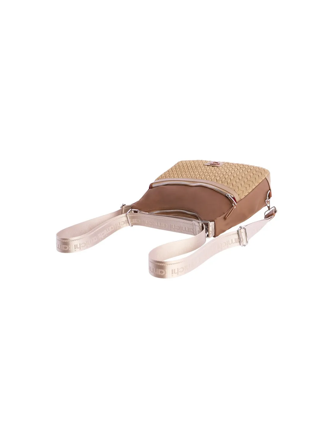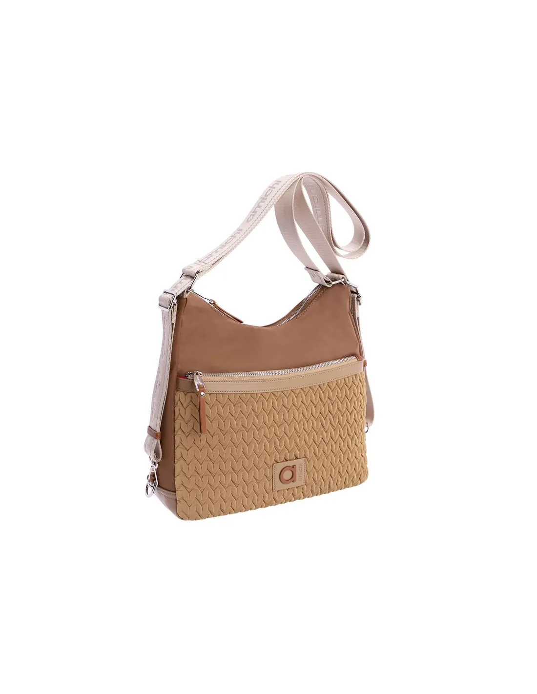 El diseño destaca por su sofisticada combinación de texturas, uniendo una parte superior de nailon resistente y sedoso con un panel inferior de acolchado trenzado que aporta un relieve moderno y exclusivo. Su paleta de colores neutros, disponible en elegantes tonos beige crema y marrón camel, asegura que sea un básico de fondo de armario extremadamente fácil de combinar con cualquier look casual o de oficina. En cuanto a su capacidad y organización, cuenta con un amplio compartimento principal con cierre de cremallera metálica y un práctico bolsillo exterior frontal para tener objetos como el móvil o las llaves siempre a mano. Los detalles están cuidados al detalle, incluyendo tiradores de efecto piel, herrajes plateados de alta calidad y el distintivo parche con el logotipo de la firma en el frontal. Ya sea cruzado como bandolera, al hombro o a la espalda, este bolso mochila convertible garantiza comodidad, seguridad y un diseño contemporáneo que se adapta a todos tus planes.