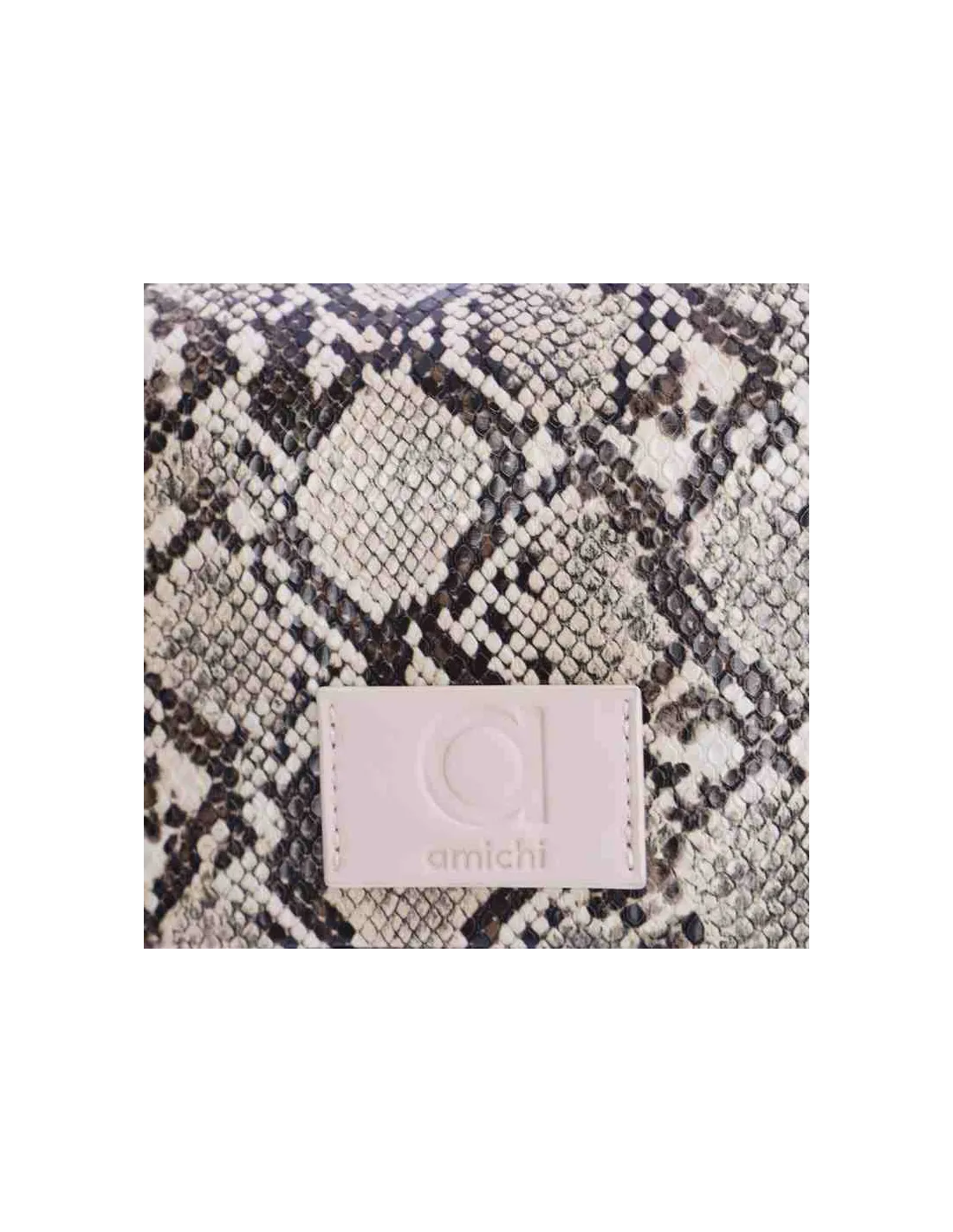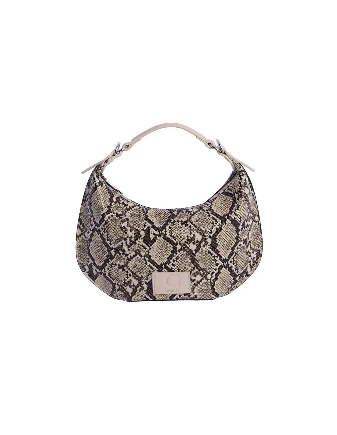 La estética de este bolso de mujer se define por su forma de media luna, una de las siluetas más buscadas de la temporada por su ergonomía y estilo chic. El exterior presenta un estampado de serpiente muy detallado en una paleta de grises, beige y negro, lo que facilita enormemente su combinación con cualquier prenda del armario. Para asegurar la máxima comodidad, incorpora un asa corta de mano y hombro en color crema, unida mediante elegantes anillas metálicas plateadas que aportan un toque de luz al diseño. En la parte frontal, cuenta con un parche cuadrado a tono con el nombre de Amichi grabado, garantizando la autenticidad de la firma. Su cierre superior de cremallera protege tus pertenencias con total seguridad, mientras que su interior espacioso permite organizar los esenciales con facilidad. Este bolso pequeño pero con gran carácter es el accesorio definitivo para quienes valoran la moda actual y los detalles de alta calidad en sus complementos.