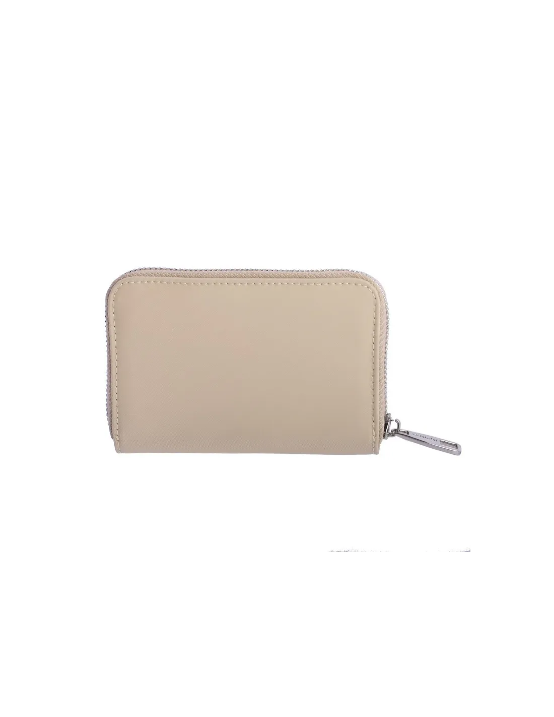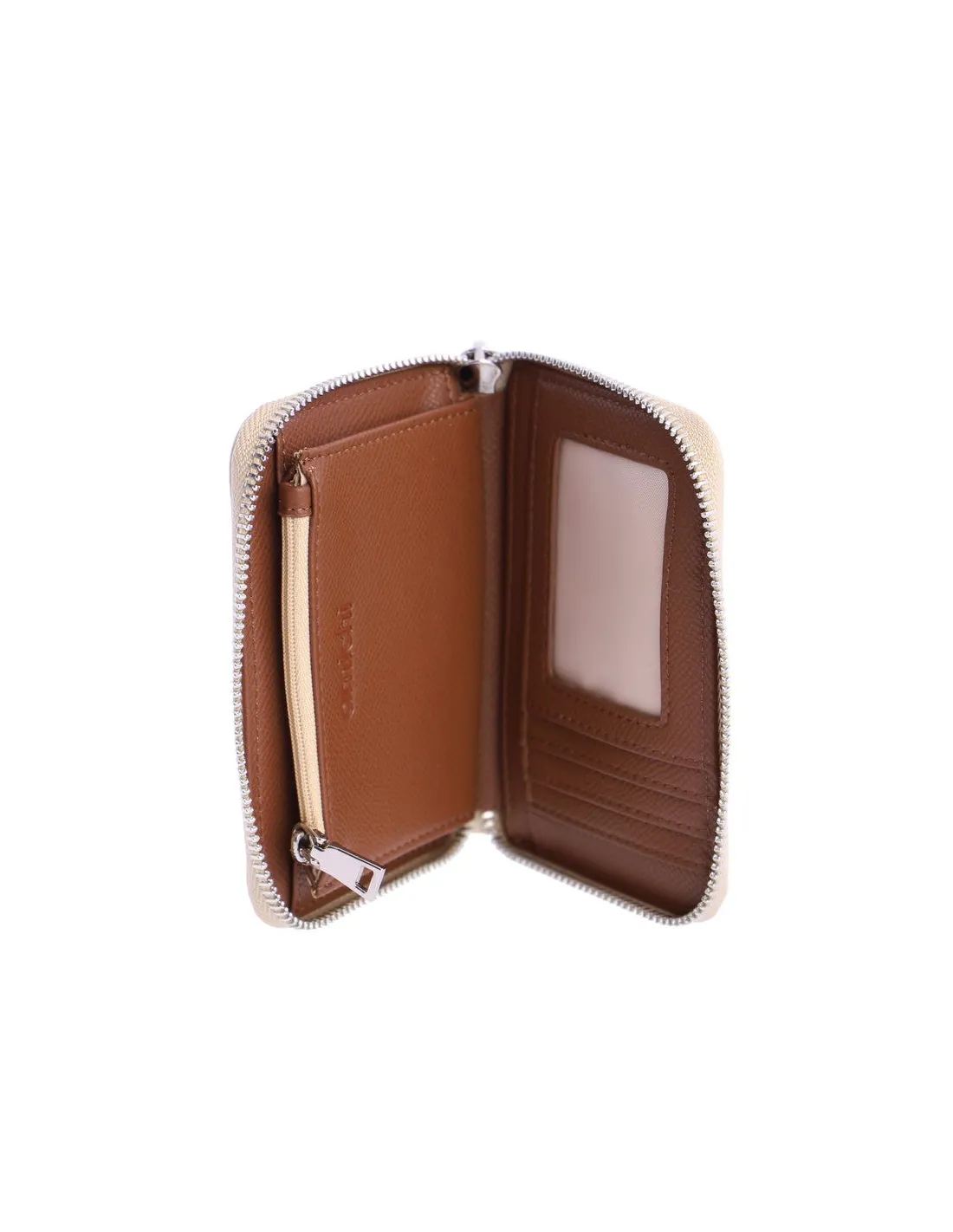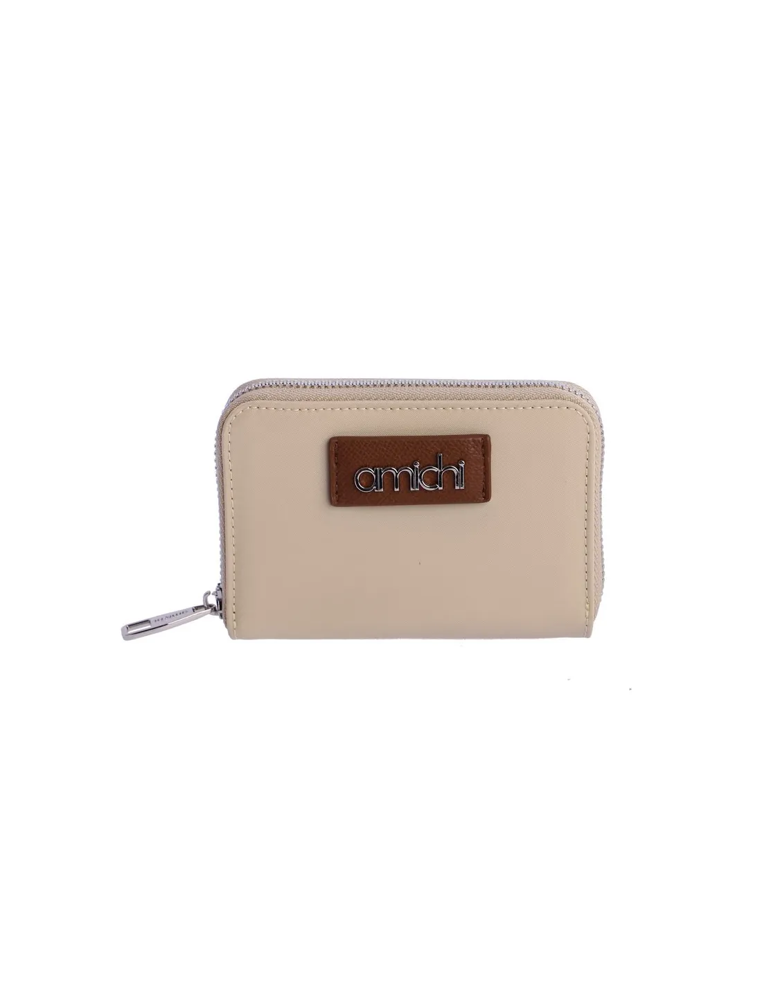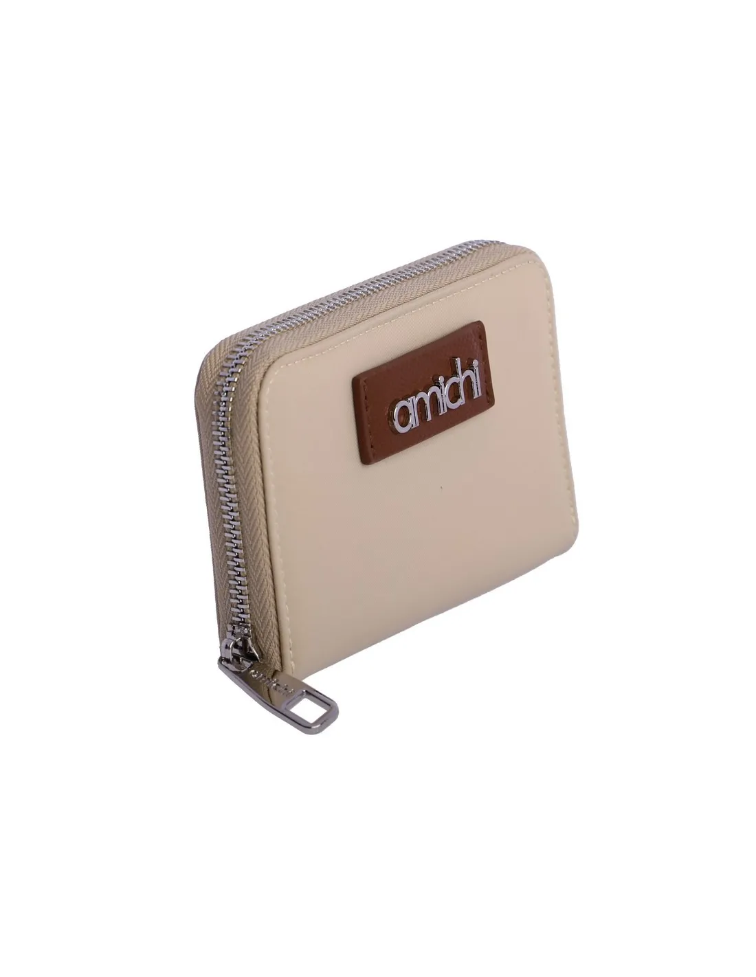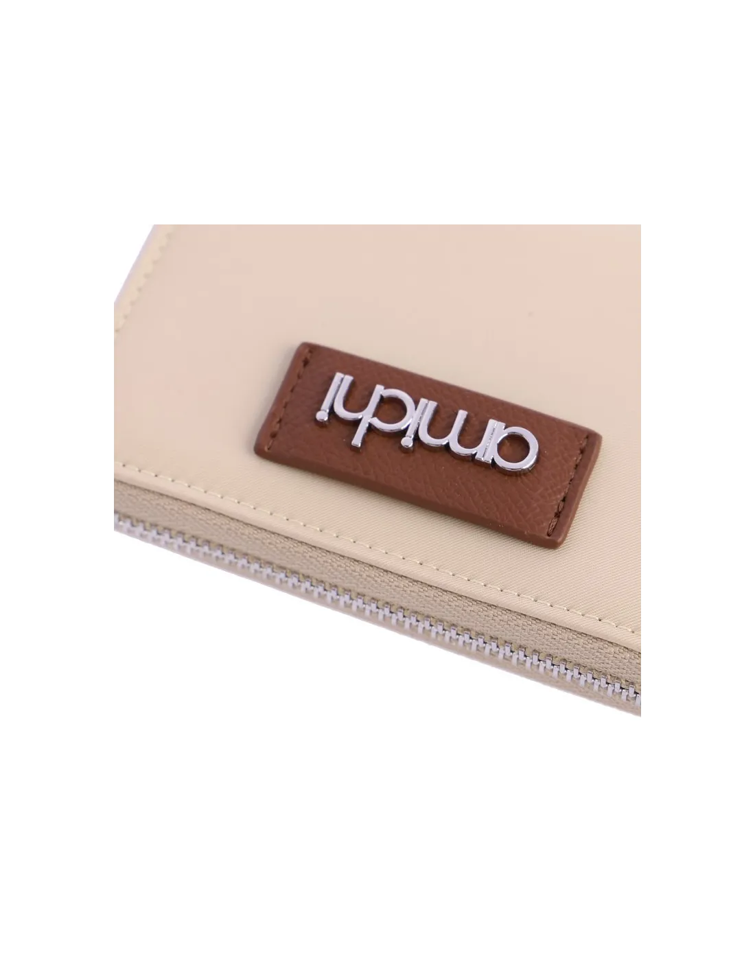 La pieza presenta un diseño moderno en color beige crema, fabricado con un tejido técnico de nailon de alta calidad que asegura durabilidad y facilidad de limpieza. En el frontal, luce un sofisticado parche de efecto piel en color marrón chocolate que resalta el logotipo metálico de Amichi en acabado plateado, aportando un toque de elegancia urbana. El sistema de cierre perimetral con cremallera metálica garantiza que tus monedas, tarjetas y billetes estén siempre protegidos. Su estructura rectangular con bordes redondeados y su tirador ergonómico lo convierten en un accesorio cómodo de manejar, perfecto para combinar con tus bolsos favoritos de la temporada.