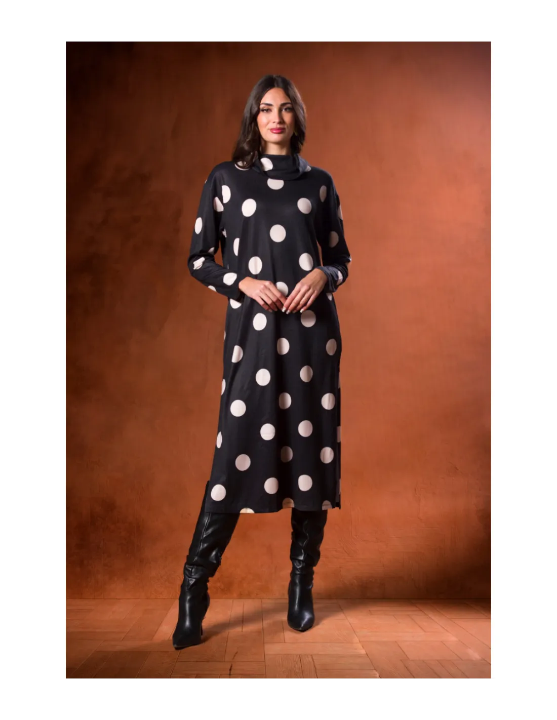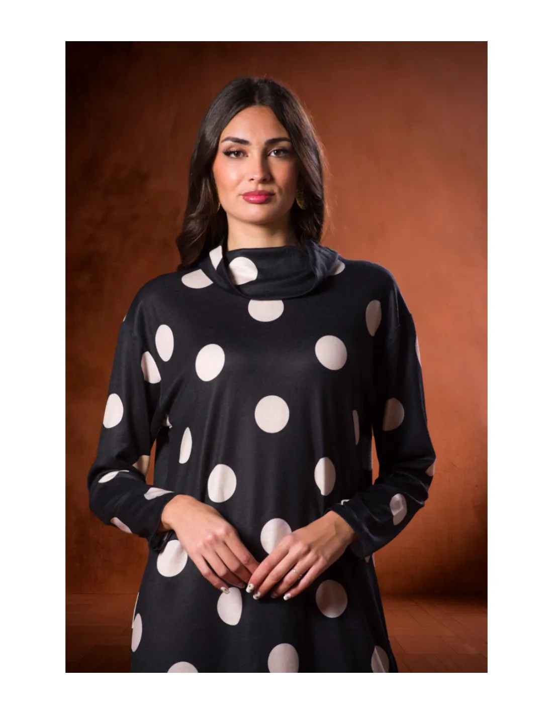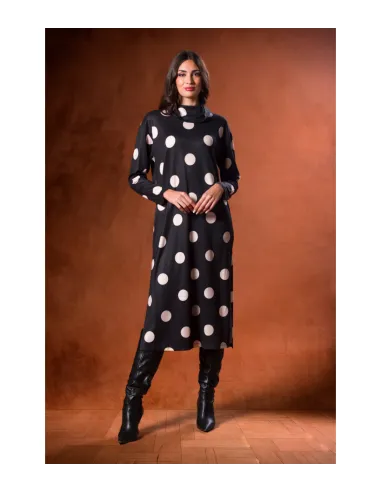 Si buscas un vestido que combine sofisticación, comodidad y un toque de originalidad, este vestido cisne de jersey con cuello alto es la opción perfecta. Su diseño en elegante color negro con grandes lunares blancos le da un aire moderno y a la vez clásico, ideal para cualquier ocasión.