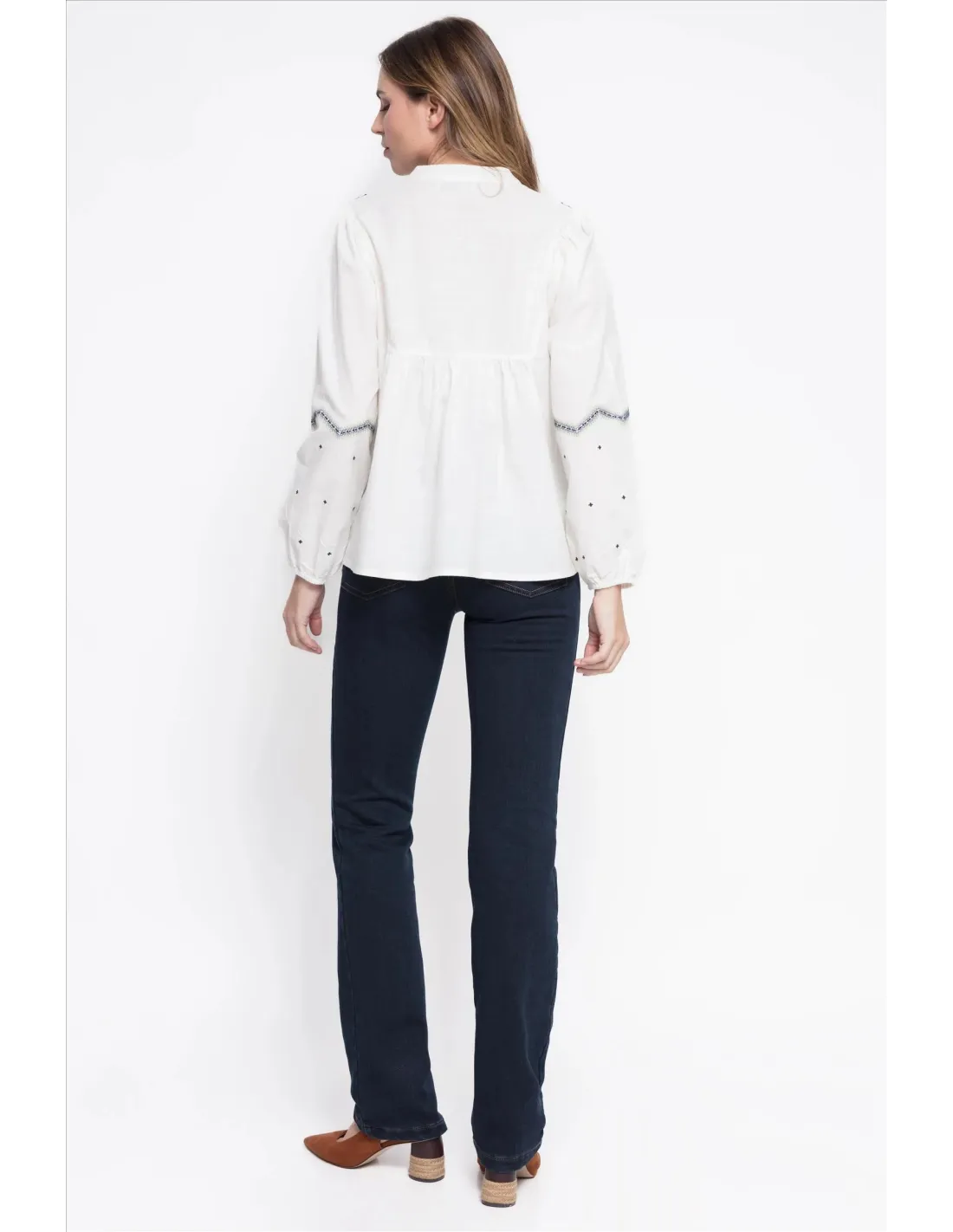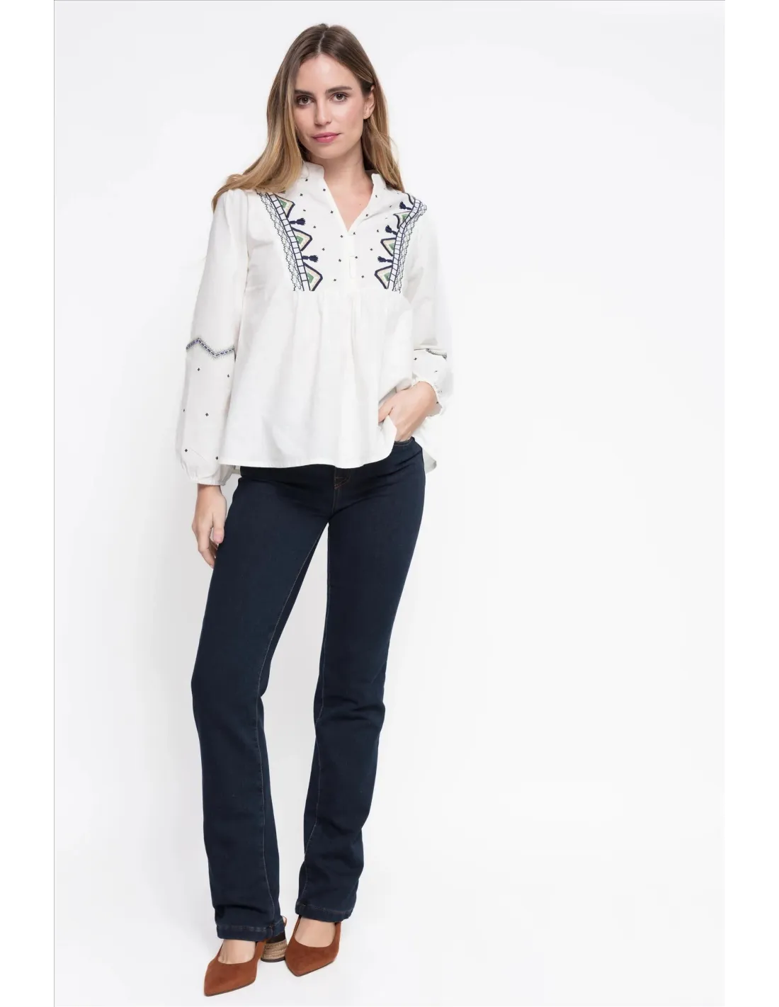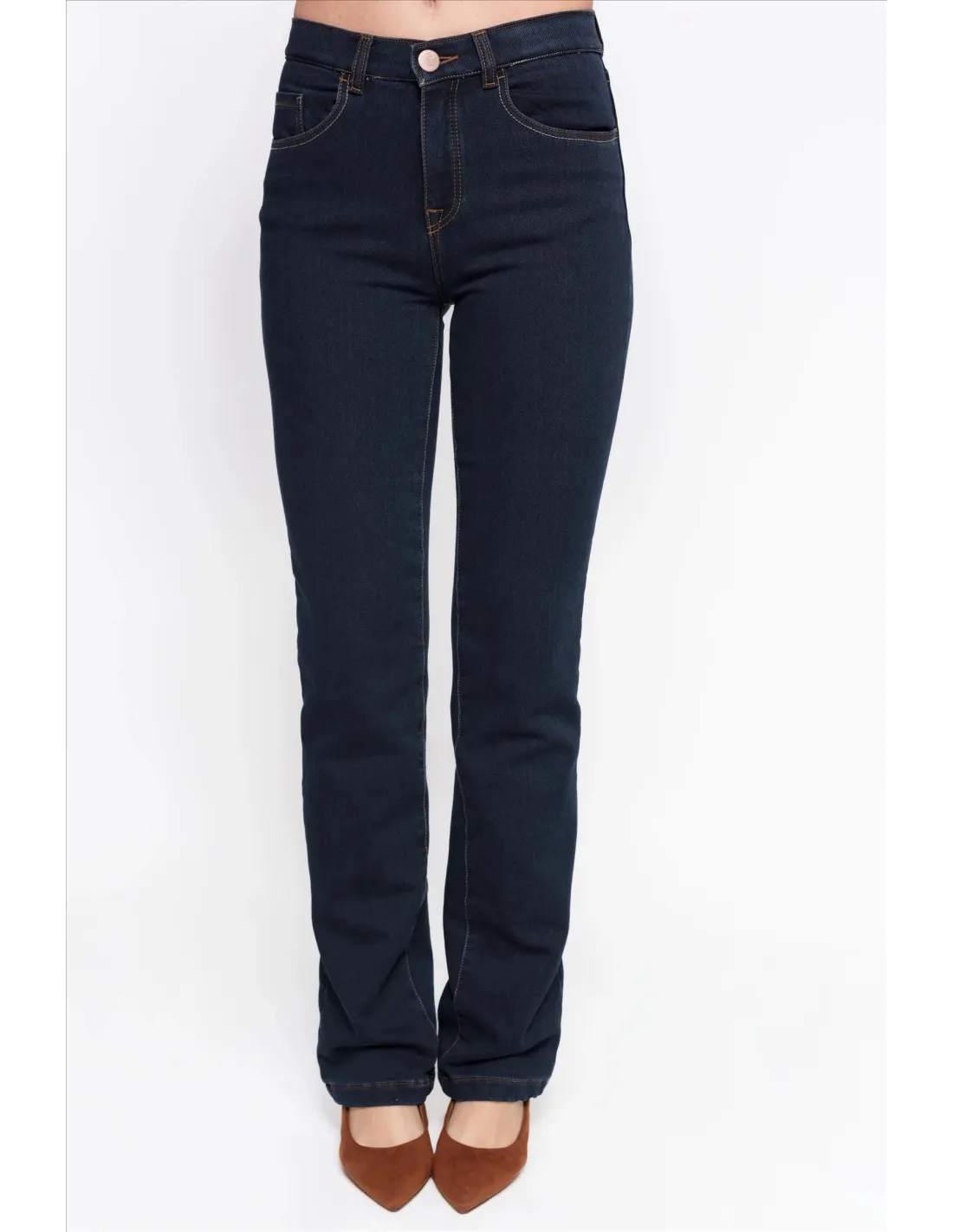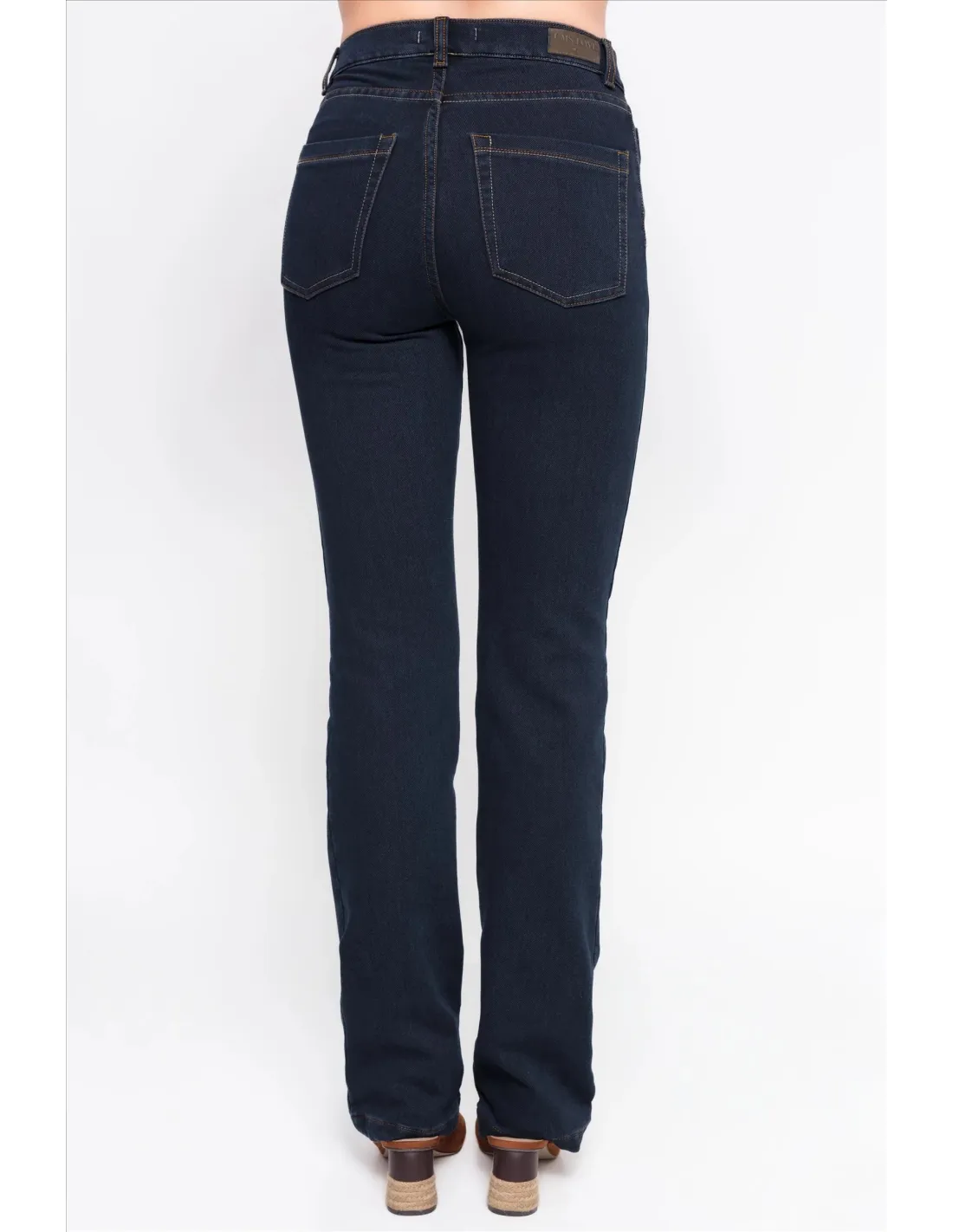 Pantalón vaquero confeccionado en algodón con licra y un interior de efecto polar que aporta calidez y confort. De corte slim fit y diseño largo, presenta tiro alto, trabillas y cinco bolsillos funcionales. Incluye cierre frontal con cremallera y botón. Disponible en un elegante tono azul oscuro.