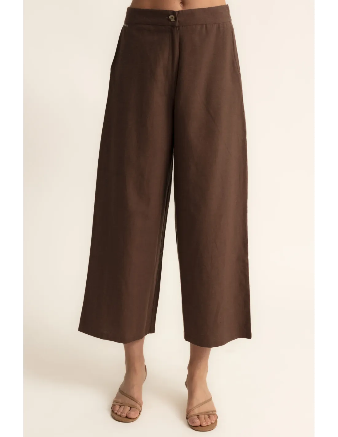 Eleva tus looks de temporada con este pantalón culotte en un profundo y cálido color chocolate. Diseñado para la mujer moderna que busca practicidad y tendencia, este modelo destaca por su pernera ancha y su largo por encima del tobillo, una combinación que aporta frescura y un aire contemporáneo a cualquier conjunto.